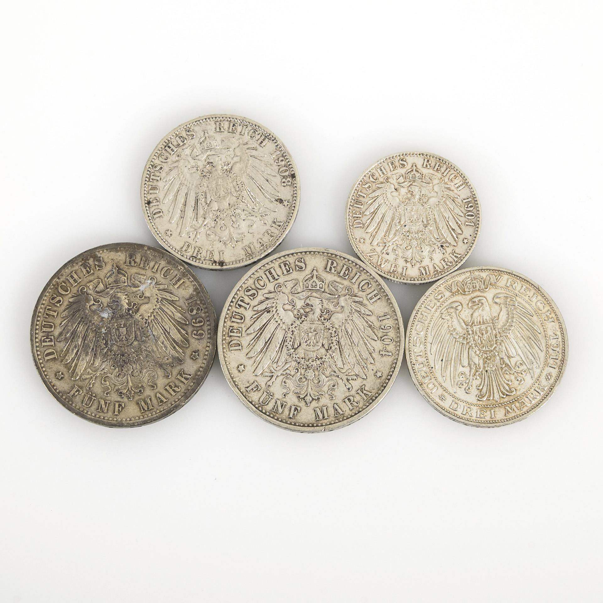 5 Mark, 1904, "Wilhelm II. Koenig von Wuerttemberg", Münzort F. / 5 Mark, 1899, "Wilhelm II. Deutscher Kaiser König v. Preussen", Münzort A. / 3 Mark, 1908, "Wilhelm II. Deutscher Kaiser König v. Preussen", Münzort A. / 3 Mark, 1911, "1811 - 1911 Universität Breslau, Friedrich Wilhelm III. Wilhelm II.", Zustand: fast vorzüglich. / 2 Mark, 1901, "Friedrich I. 1701, Wilhelm II. 1901", Zustand: fast vorzüglich. Zustand: gut -vorzüglich.