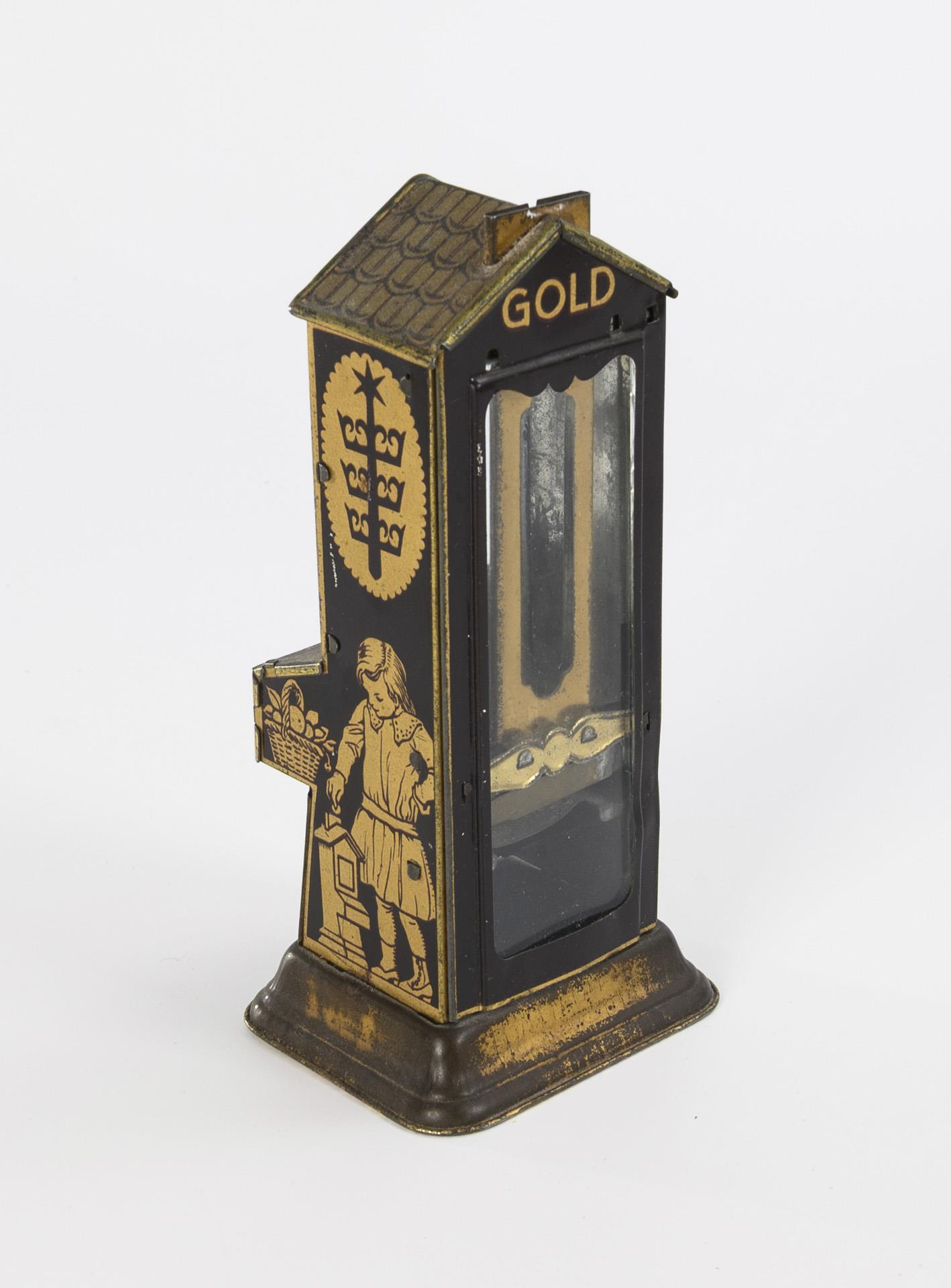 Blech, braun und goldfarben lithografiert. H 16 cm.