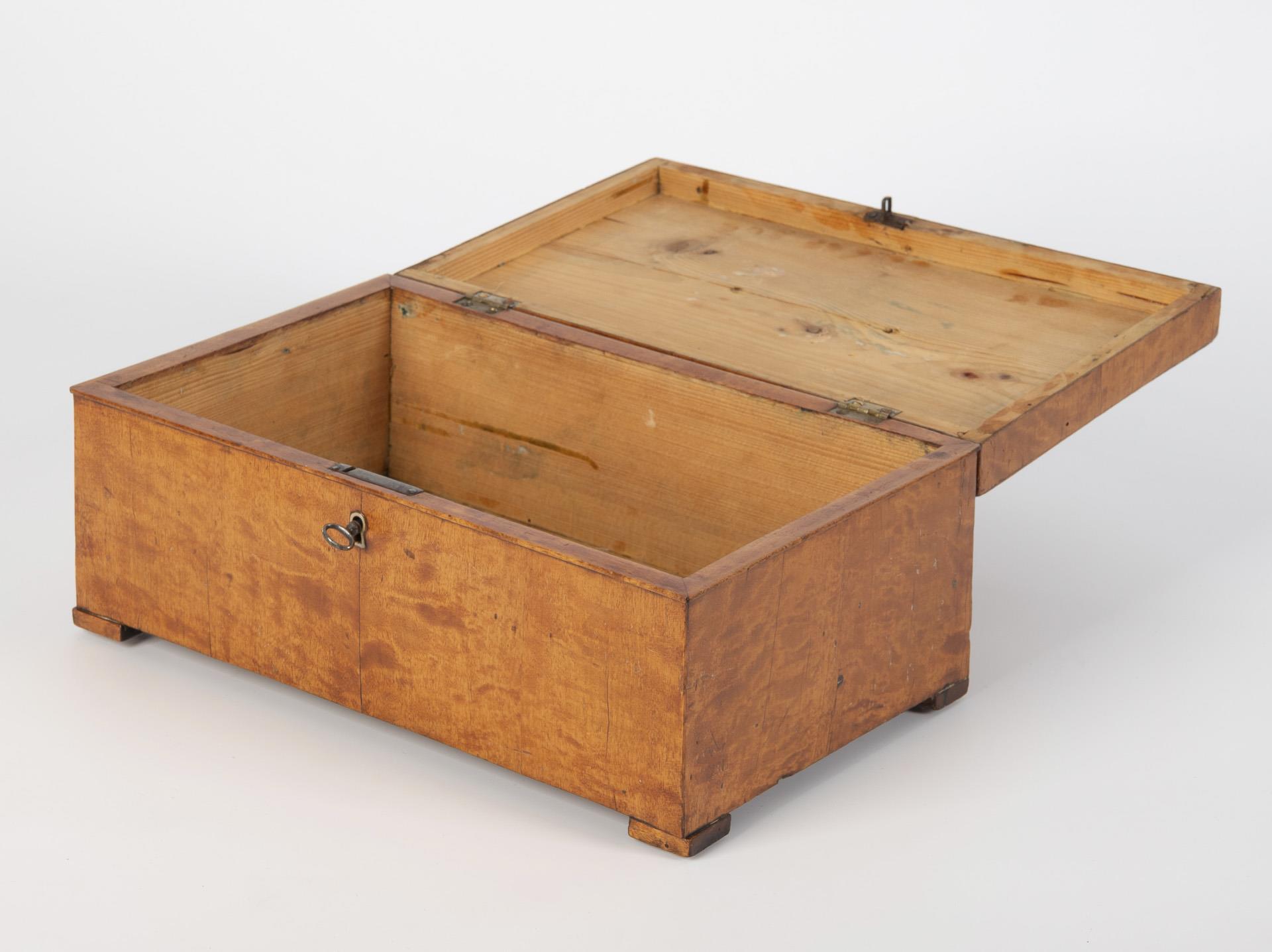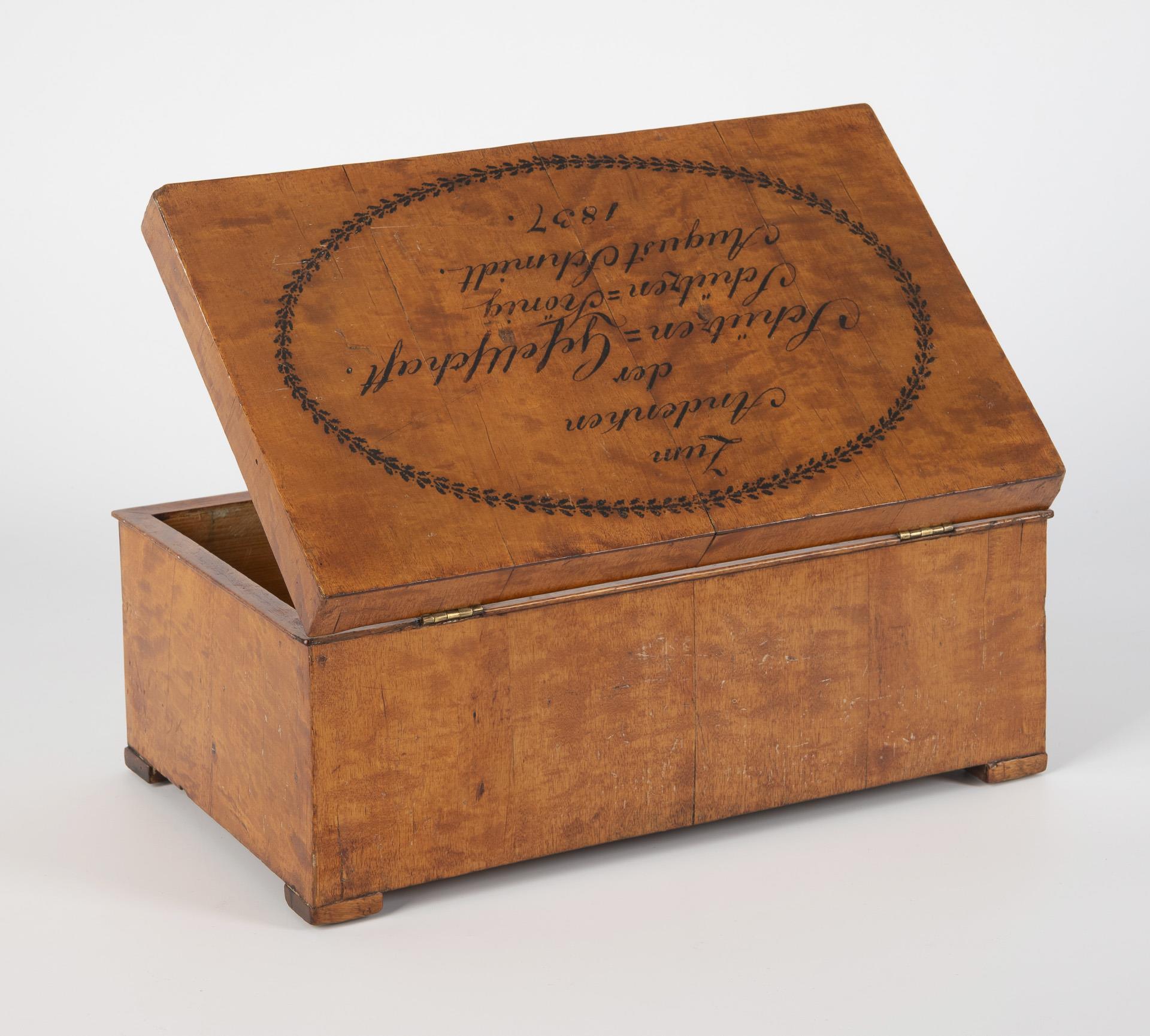 Biedermeier-Schatulle mit Widmung: "Zum Andenken der Schützen = Gesellschaft. Schützen = König August Schmidt. 1837". Vorderseitig mit einem Knopf aus Bein sowie Bein-Umrandung des Schlüssellochs. Das Schloss mit erhaltenem, zugehörigen Schlüssel. Alters- und Gebrauchsspuren; Risse im Furnier, ein Riss im Innendeckel geklebt. Der Deckel etwas verzogen, Schloss schließt.