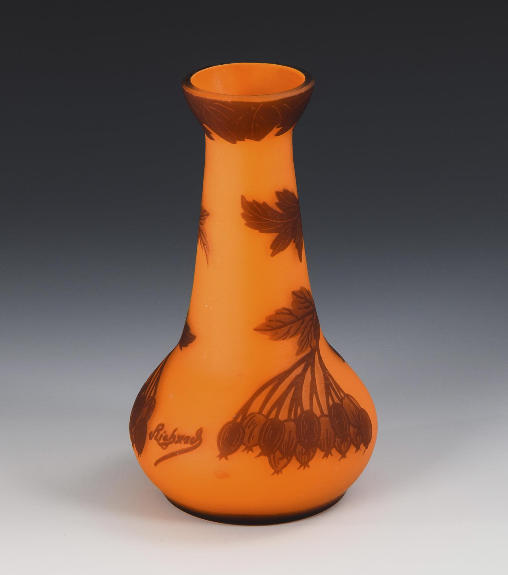 Bauchiger Korpus mit konischem Hals und ausgestellter Mündung. Umlaufend geätztes Dekor: Elsbeernzweige mit Fruchtdolden.