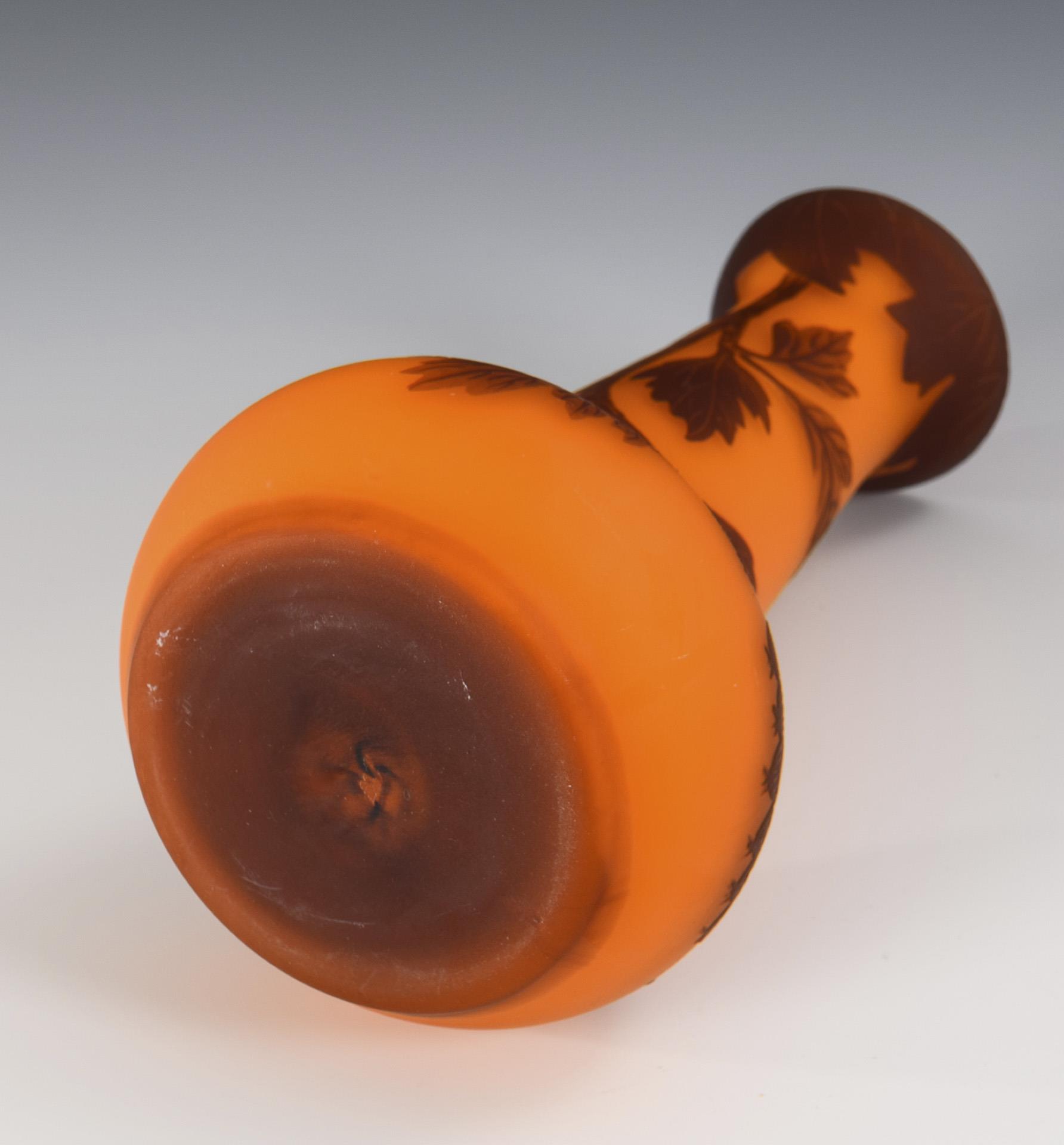 Farbloses Glas mit orangefarbenem Innenfang und braunem Überfang. H 17 cm.