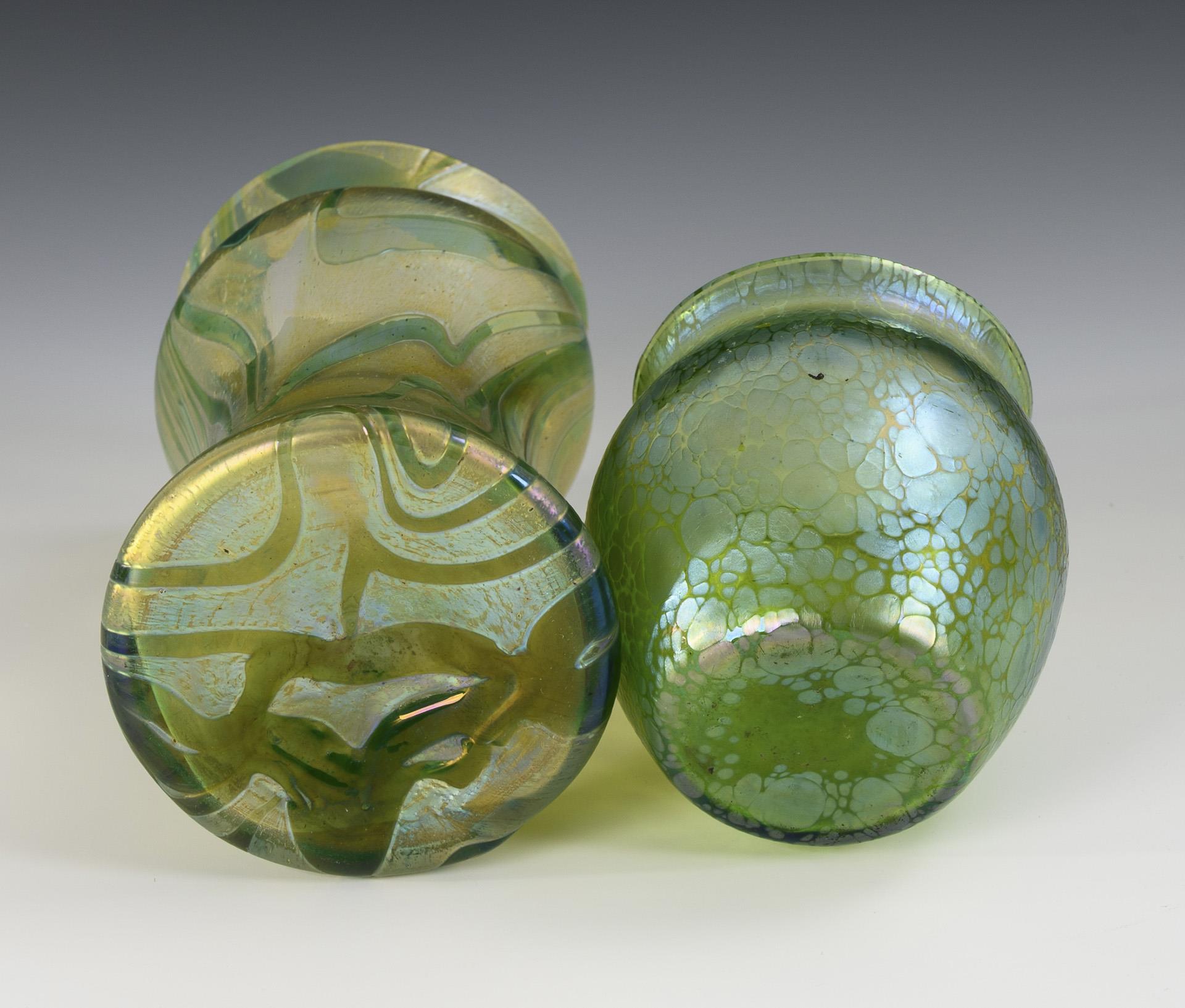 1x LOETZ, 1898, Dekor "Creta Papillon": kleine Balustervase aus grünem Glas mit silbergelben Kröselaufschmelzungen, irisiert. / 1x wohl FRITZ HECKERT, um 1900: kleine Flötenvase aus farblosem, mit gelben Kröseln bedecktem Glas, darüber umsponnen mit einem hellgrünen Faden, irisiert. 1x mit Randchip.