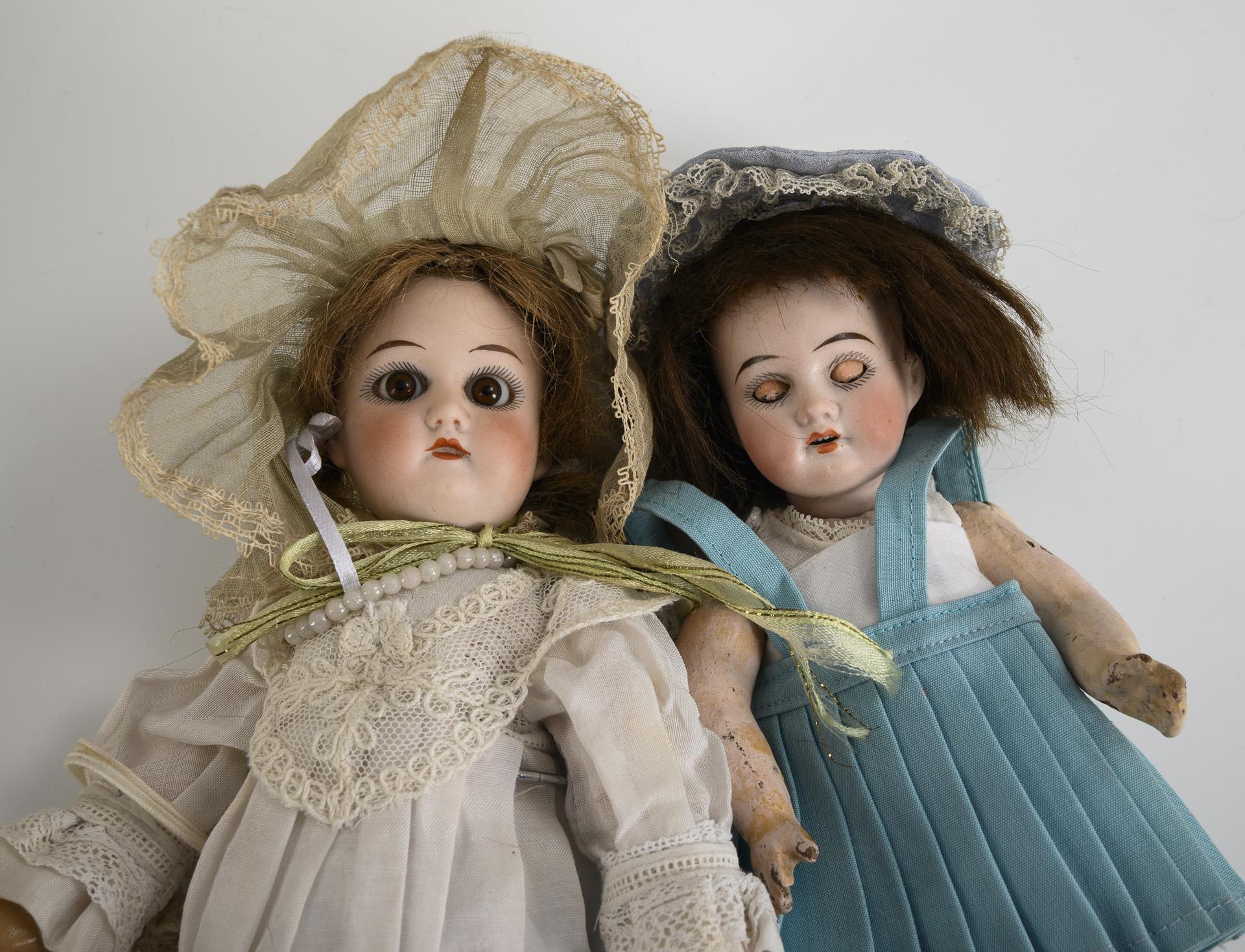 Beide mit Kurbelkopf, braunen Augen, Perücke, Massekörper und Hut. 1x Schlafaugen, braune Mohairperücke, blauer Faltenrock. Körper mit Defekten, L 22 cm. / 1x feste Augen, blonde Perücke, 7-teiliger Gliederkörper, weißes Kleid. Körper übermalt, L 25 cm. Bespielt, mit Altersspuren.