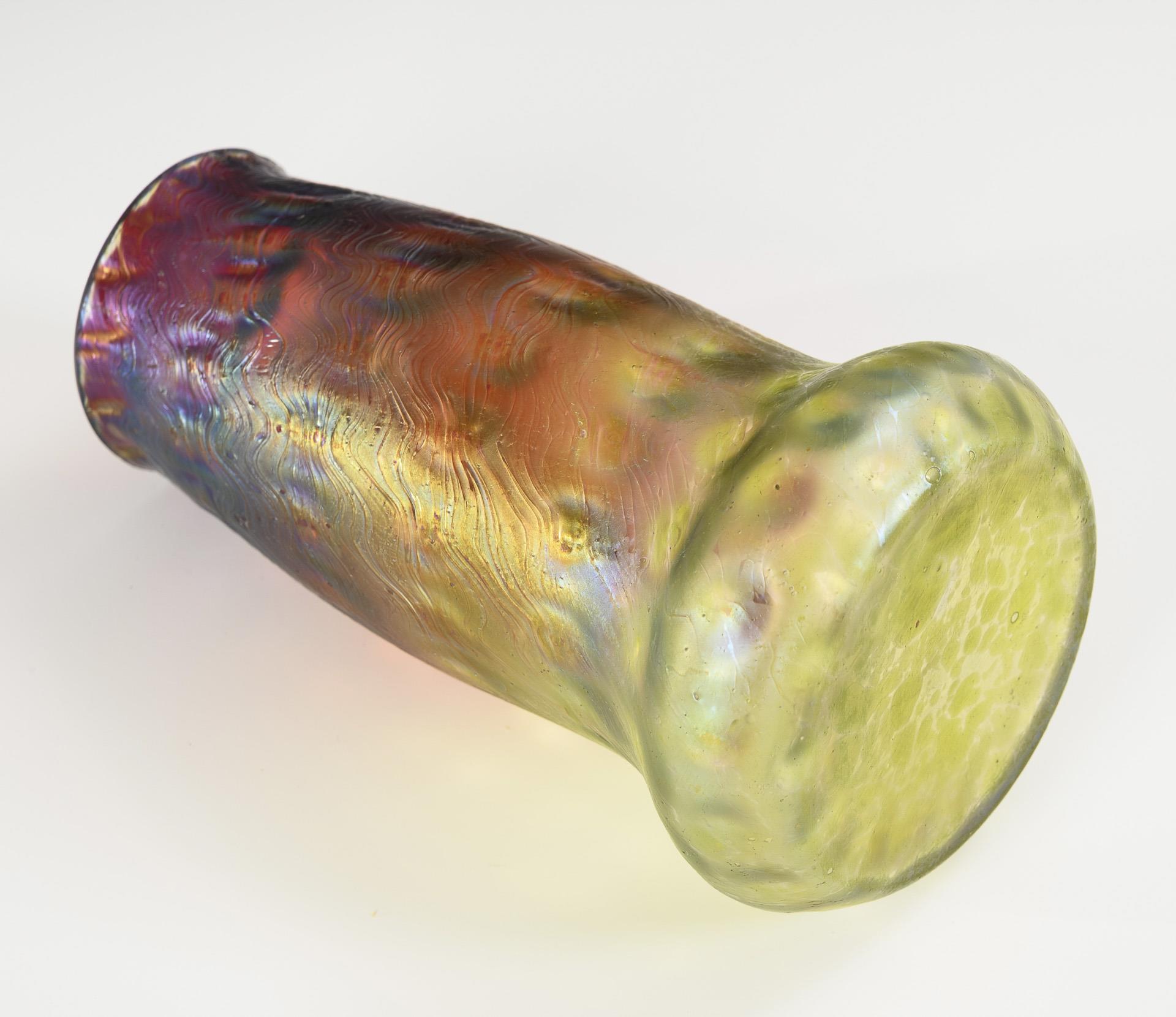 Farbloses Glas, von oben verlaufend rubinrot unterfangen, eingearbeitete hellgrüne Krösel, irisiert. H 15 cm.