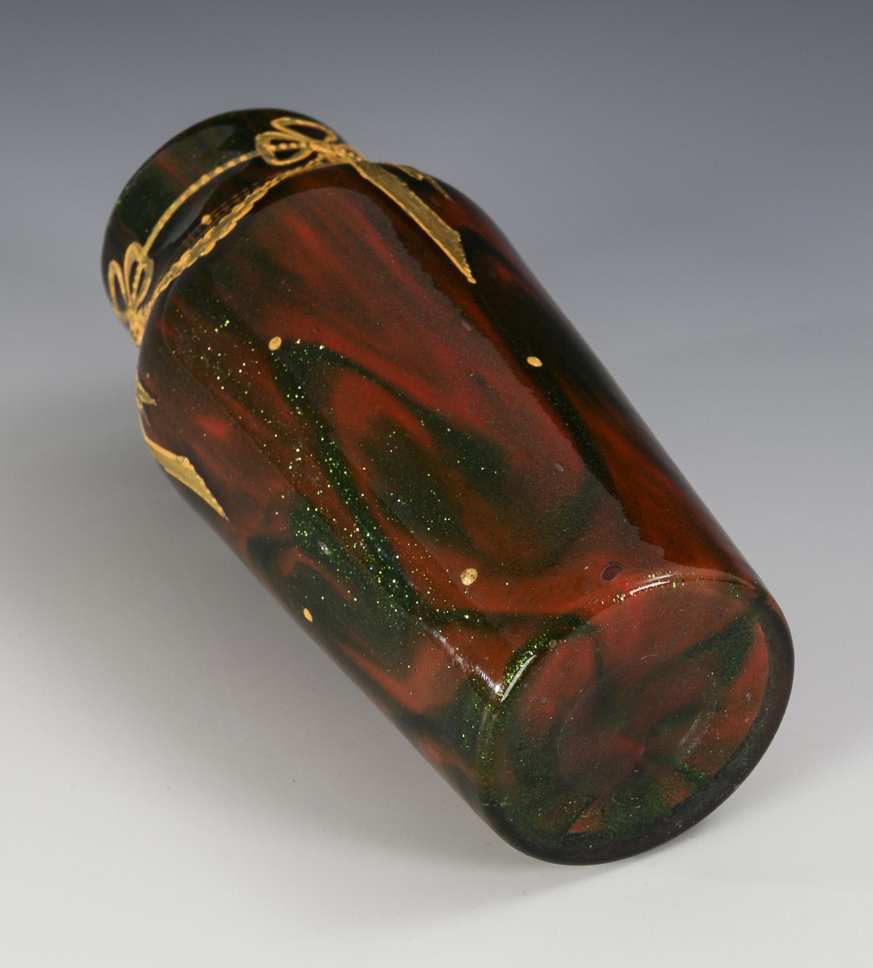 Opakrotes, mit grünen Aventuringlasfäden marmoriertes, farblos überfangenes Glas. H 14 cm.