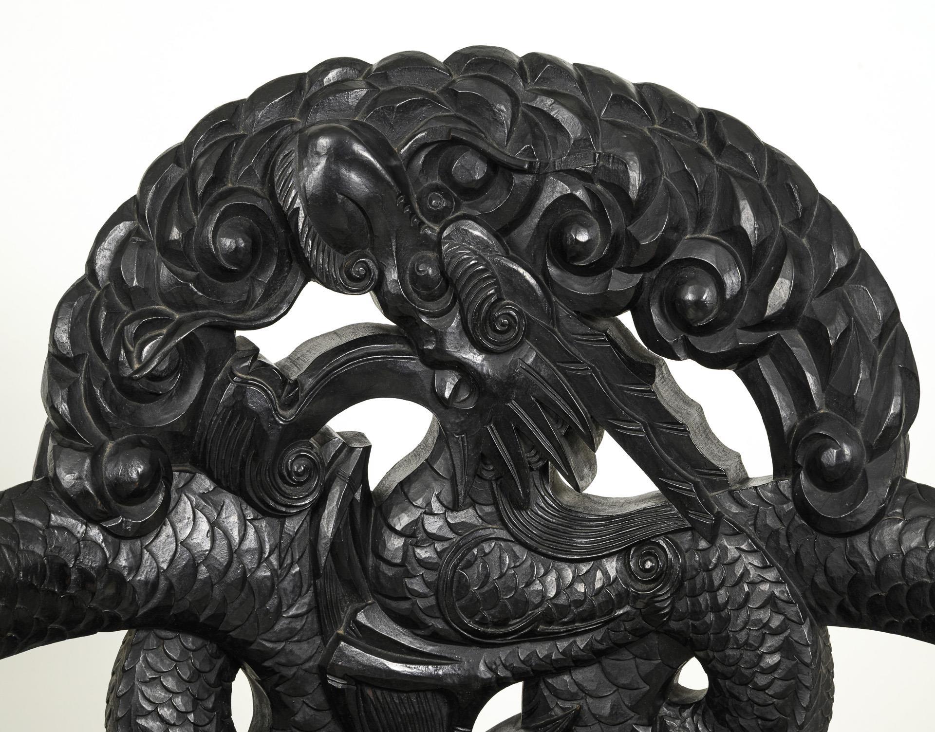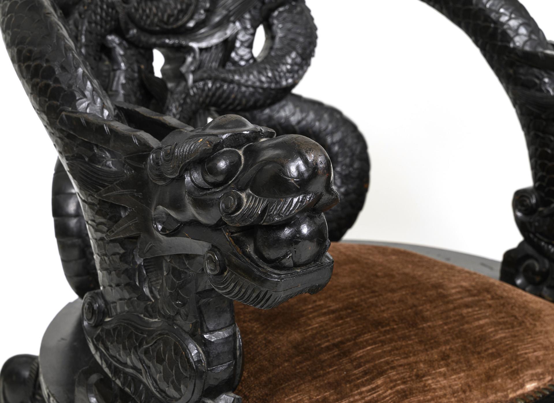 Repräsentative Armlehnstühle aus schwarz gebeiztem Holz mit dunkelroten Samt-Sitzbezügen. Die Lehne bilden verschlungene Drachenkörper, deren Köpfe die Armlehnen bilden. Alters- und Gebrauchsspuren. ein Stuhl mit Trockenriss im unteren Lehnenteil; die Zargen innen mit Klebespuren.