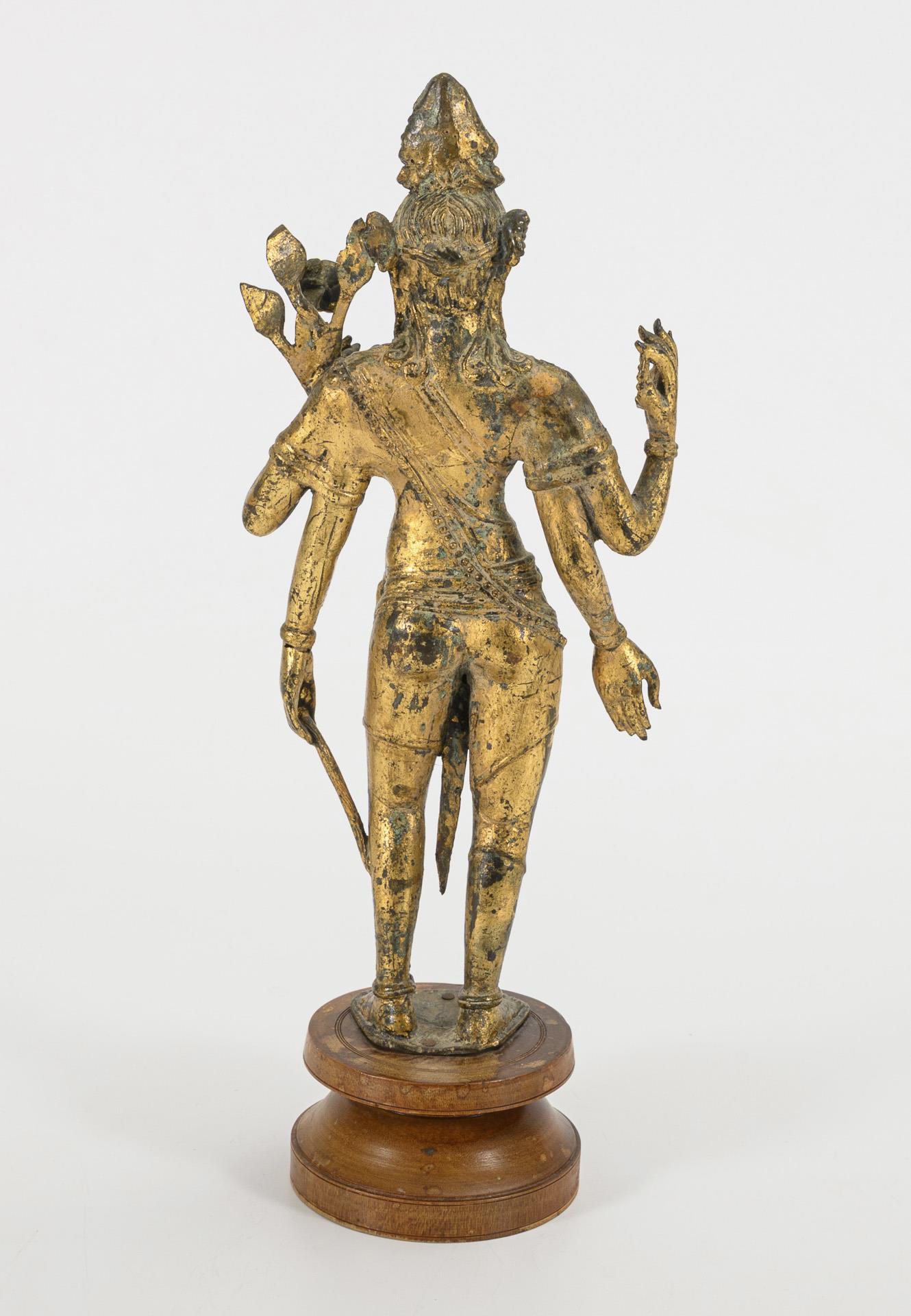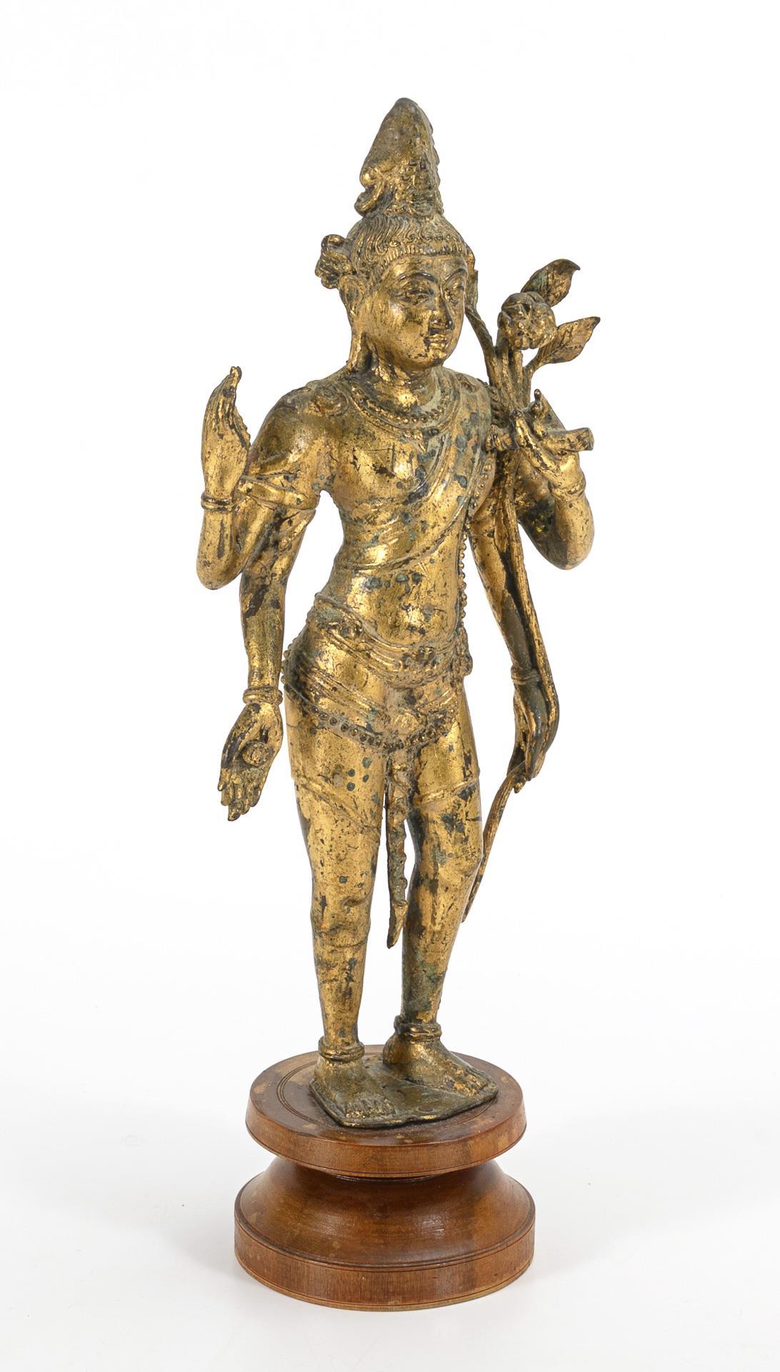 Goldfarbene, stehende Figur mit vier Armen, in einer Hand einen langen Pflanzenstengel, in den anderen Händen eine einzelne Blüte, Kette und Schriftrolle(?). Fußplatte auf gedrechselten Holzständer genagelt, Sockel wohl später ergänzt.