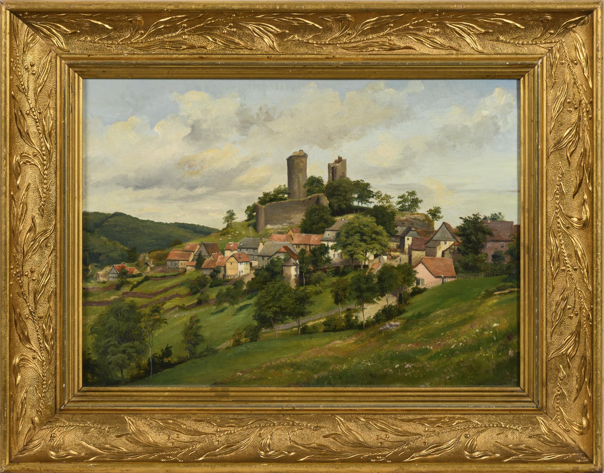 Ansicht des Ortes Oberreifenberg mit der markanten Ruine unter leicht wolkigem Himmel. Minimale Altersspuren.