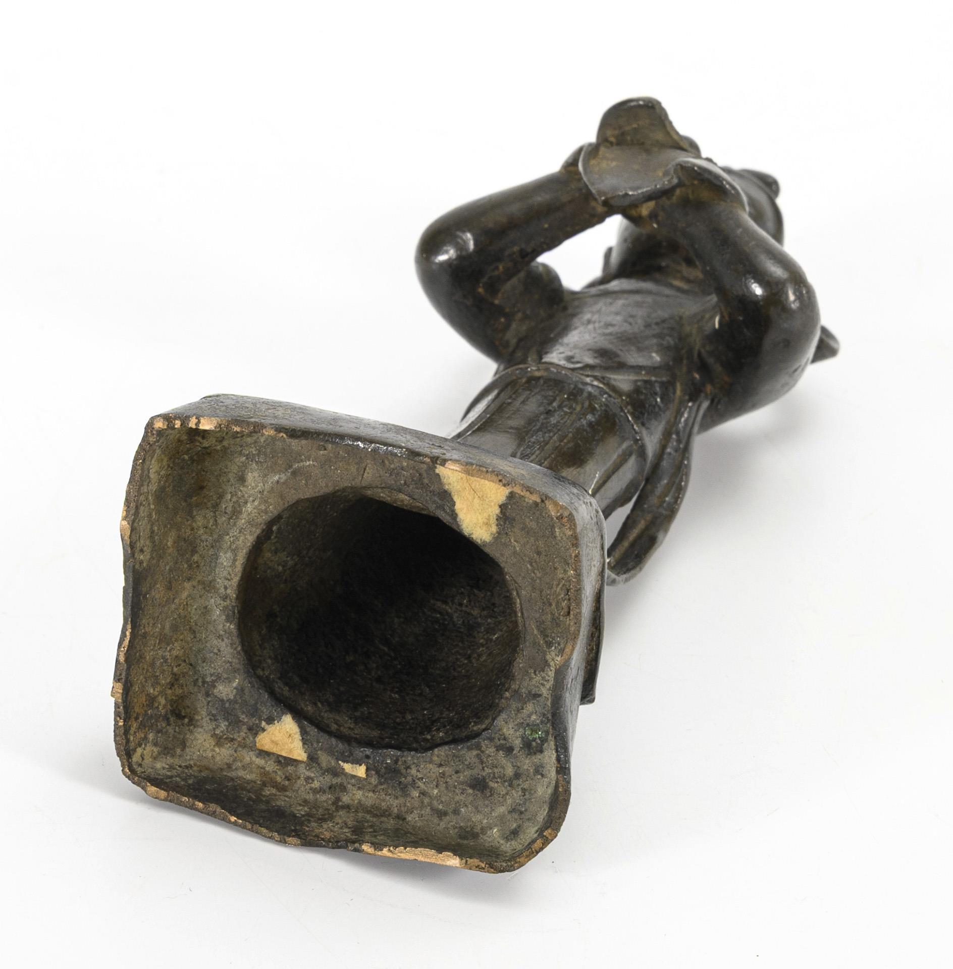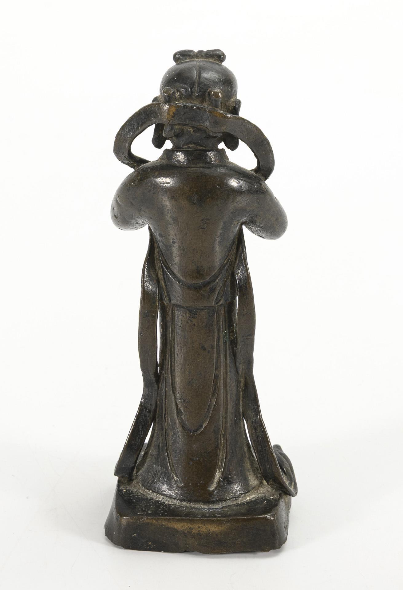 Stehende Figur in langem Gewand, eine Gabe bringend. Mit langen, vom Kopf ausgehenden Bändern.