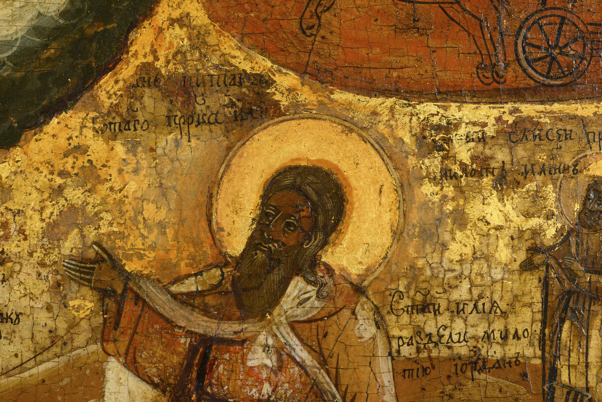Der orthodoxe Heilige in verschiedenen Szene wie der Rabe, der Heiligen Brot bringt, oder der Himmelfahrt. Altersspuren.