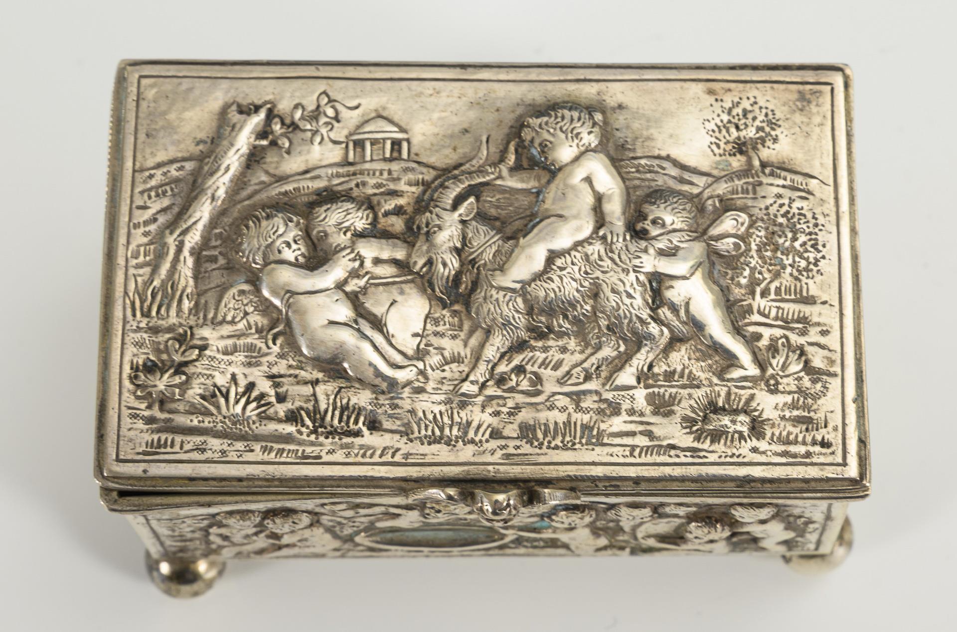 2 flache Etuis und kleine Dose auf Kugelfüßchen. Gebrauchsspuren, Dellen, 1x Scharnier verbogen.