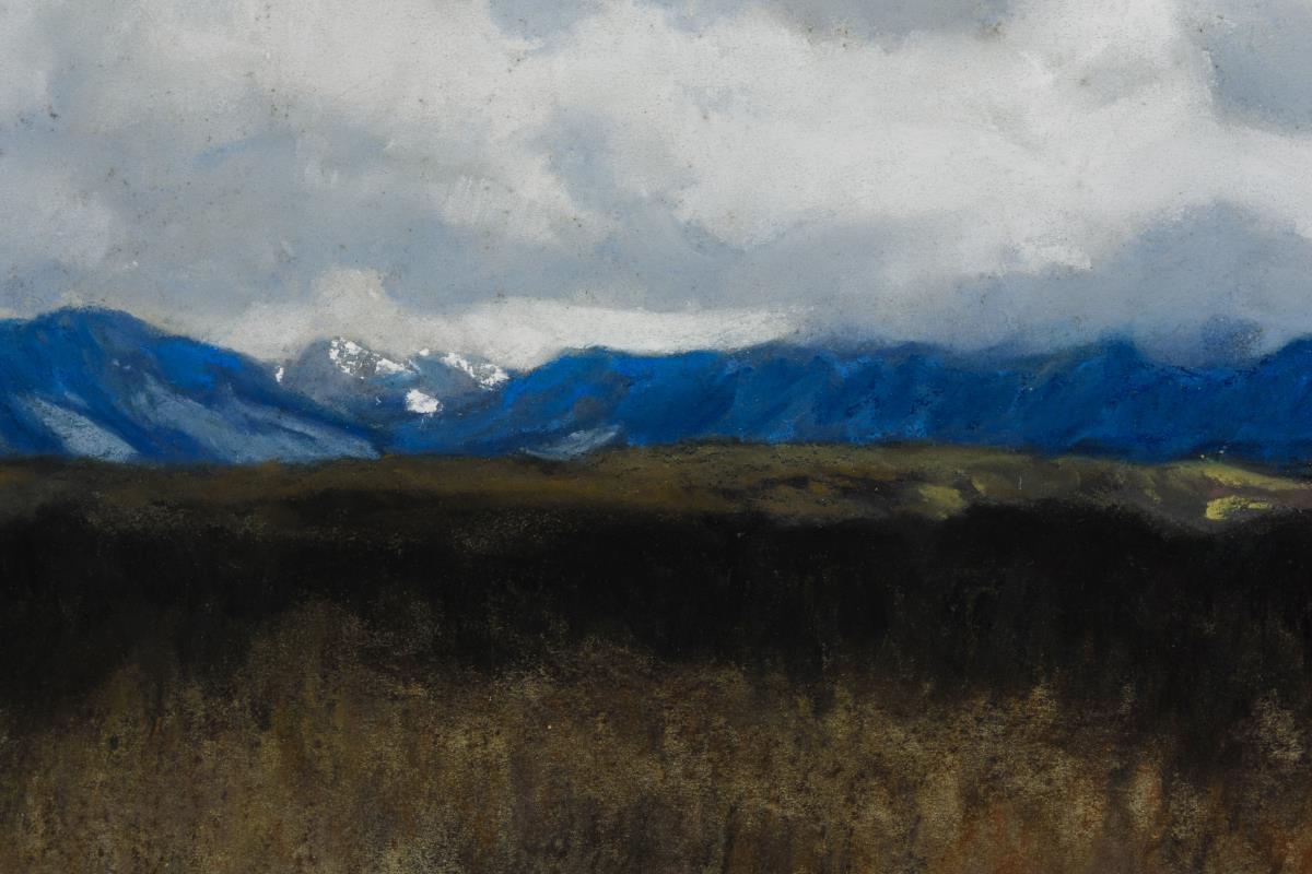Weite Herbstlandschaft mit den Bergen am Horizont unter riesigem Wolkenhimmel.