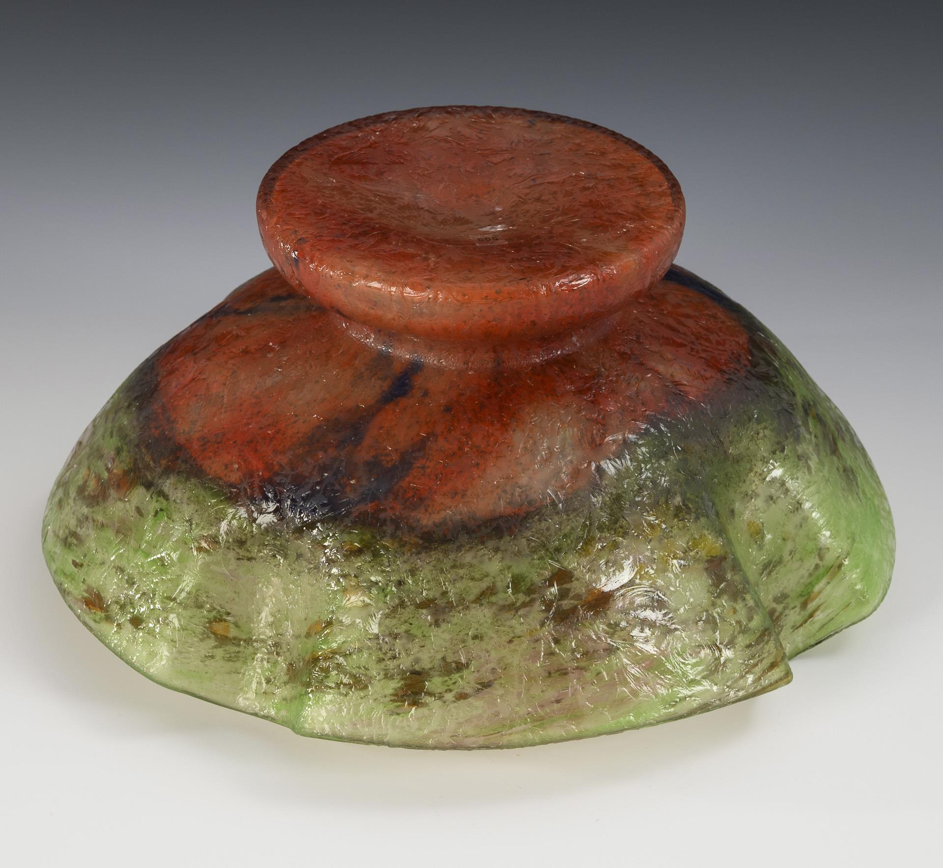 Vierpassige Schale mit rundem Fuß. Oberfläche rauh geätzt (Leimeis-Technik). 1 kleiner Randchip.