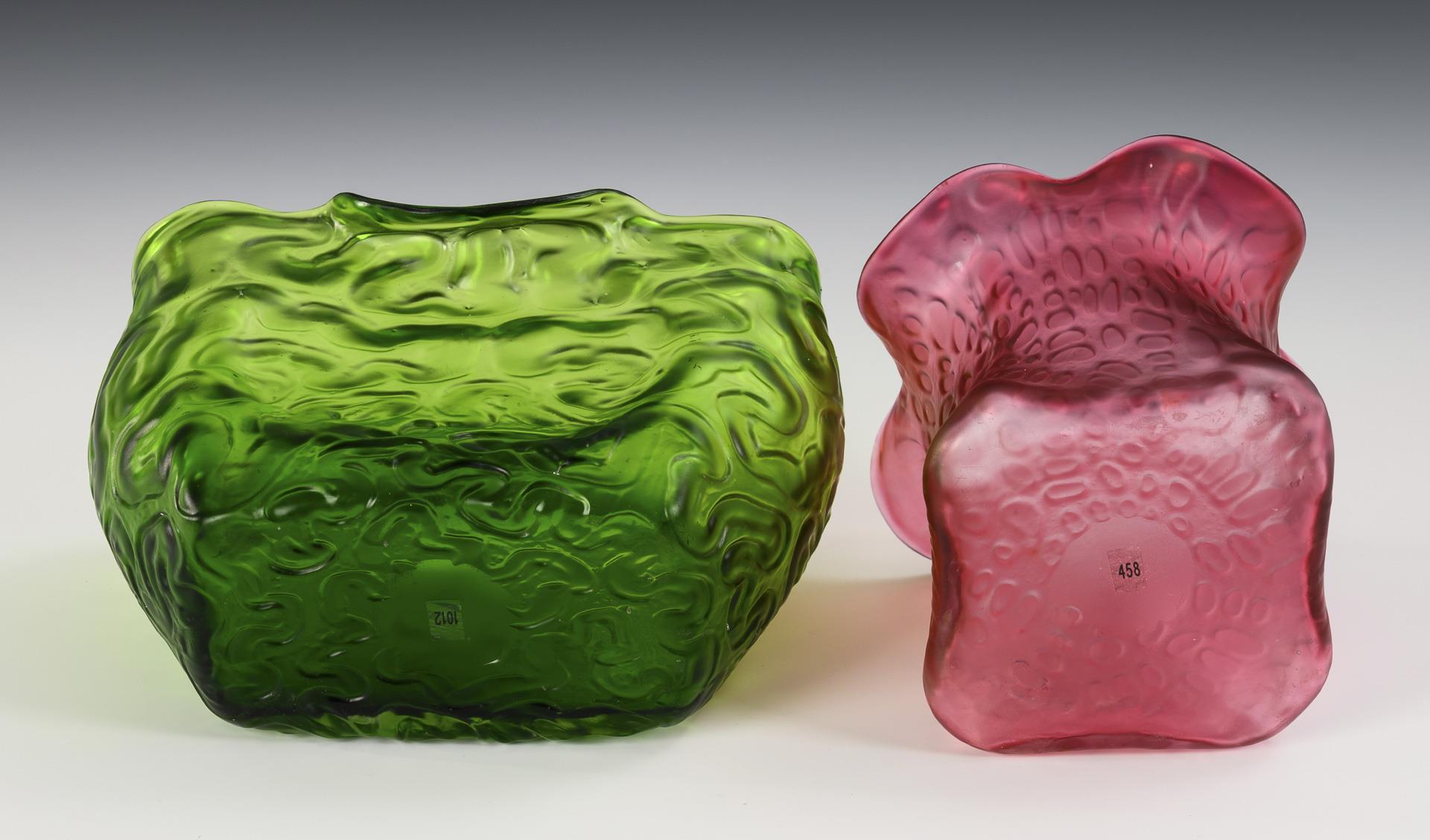 1x um 1900, farbloses, grün unterfangenes, irisiertes Glas: rechteckige Schale mit einem mäandernden Muster als optischem Dekor, Mündung an den Längsseiten auslappend und an den Schmalseiten leicht nach innen gedrückt. / 1x um 1905, farbloses, rosa überfangenes Glas: quadratische Vase mit leicht gedrehter, zur vierfach gewellten Mündung übergehender Wandung, Oberfläche mit unregelmäßigen, teils verzogenen Vertiefungen.