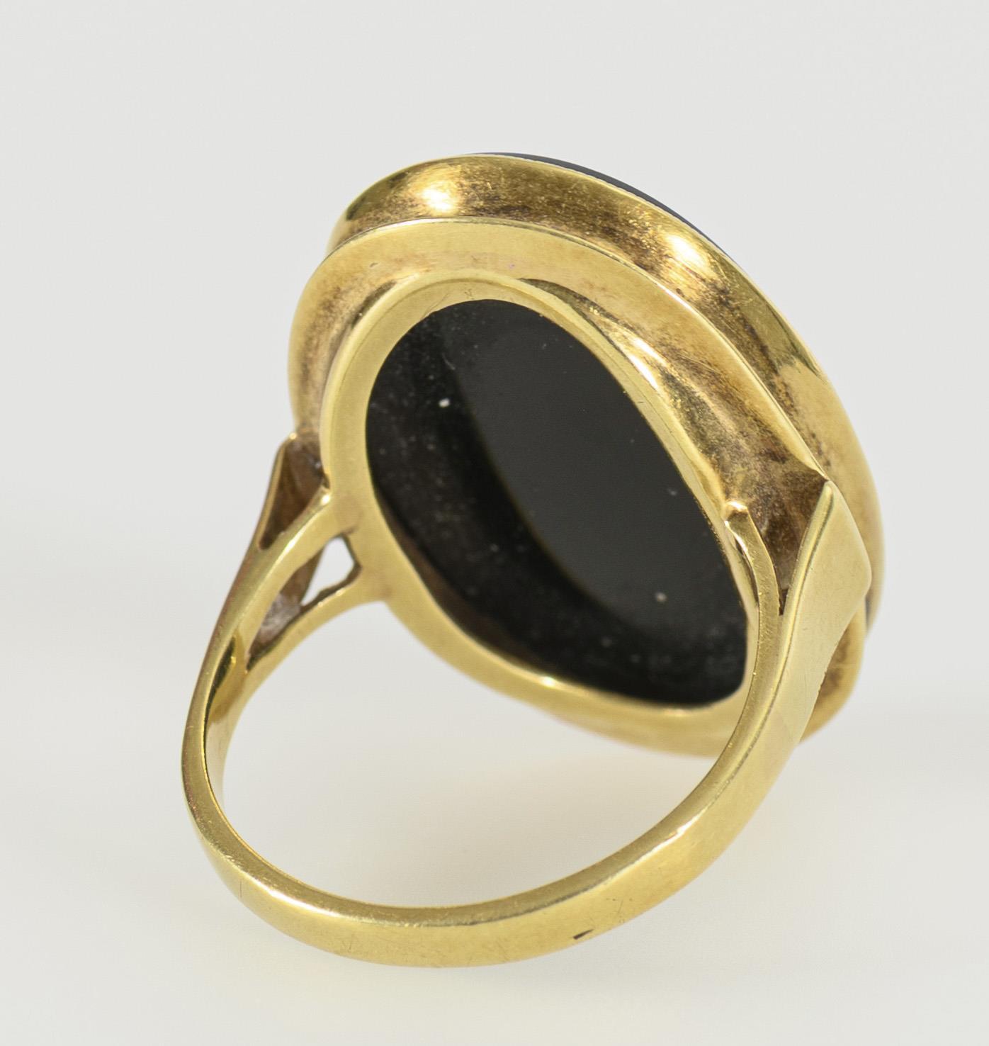 Ring mit einer großen, ovalen Onyx-Tafel zwischen einer sich verjüngenden Schiene. Onyx-Tafel mit leichten Tragespuren.