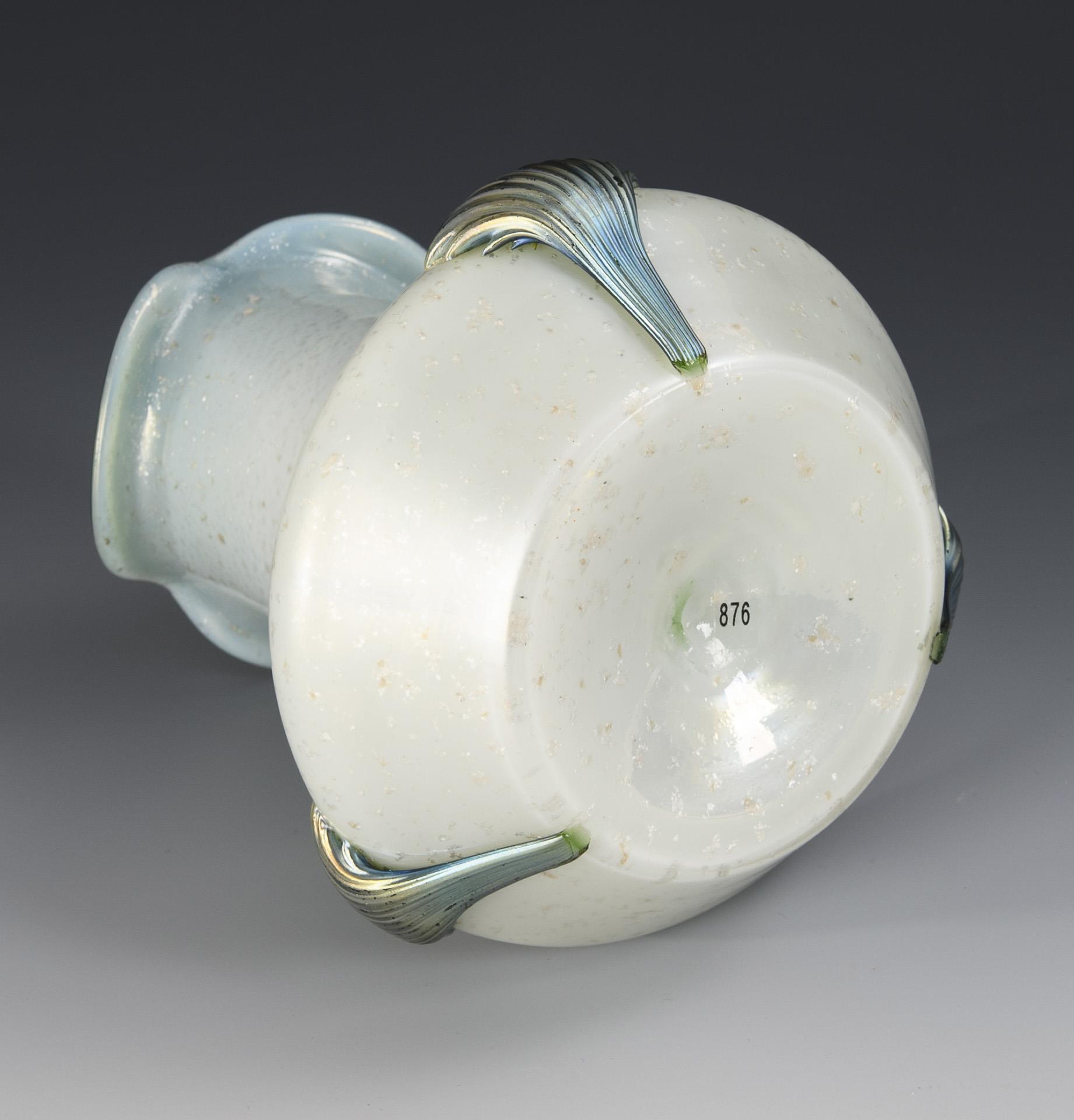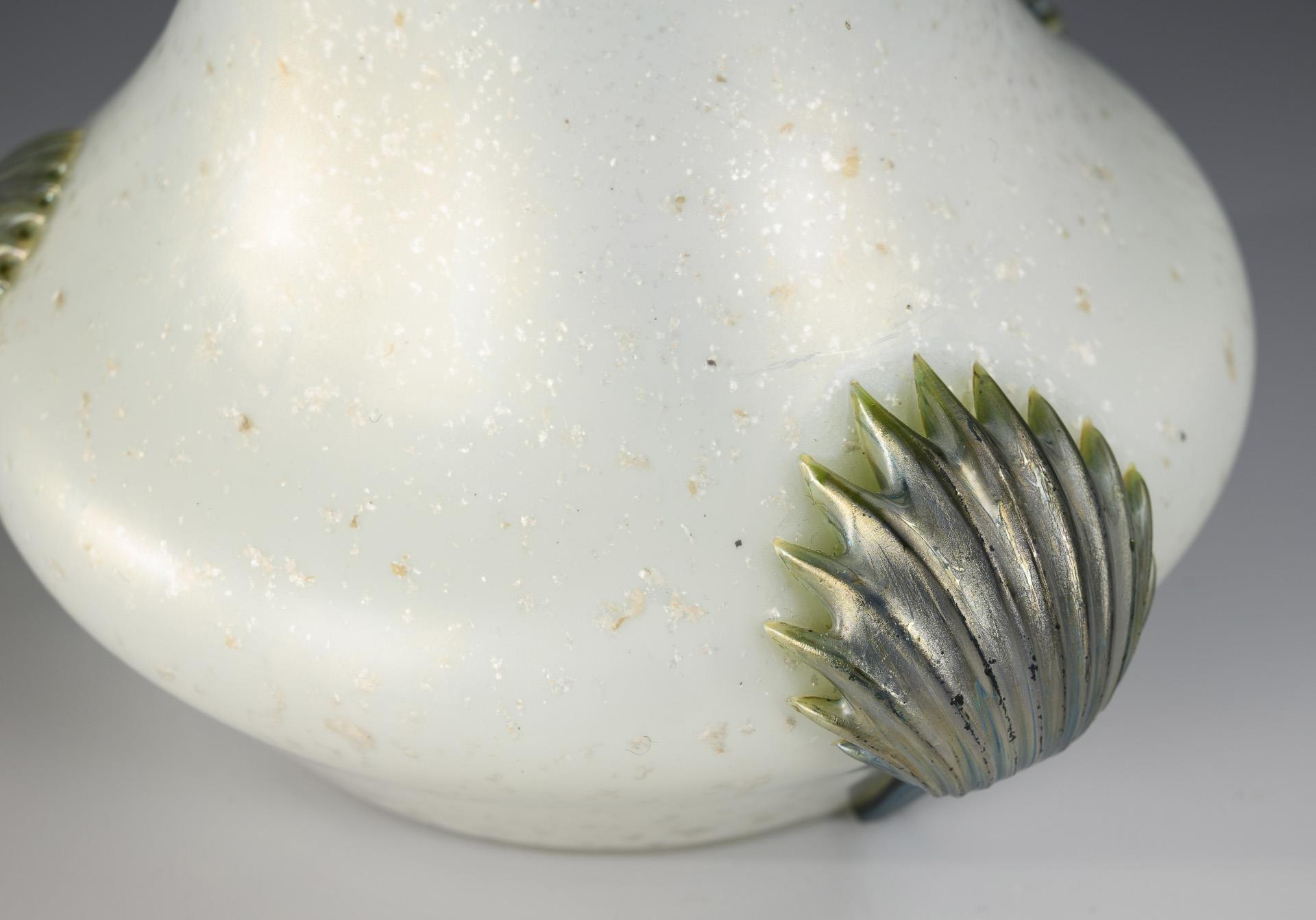 Weißes Opalglas, von oben opalgrün verlaufend unterfangen, Klarglasüberfang mit eingeschmolzenen silbernen Glimmerschuppen, irisiert. H 14,5 cm.