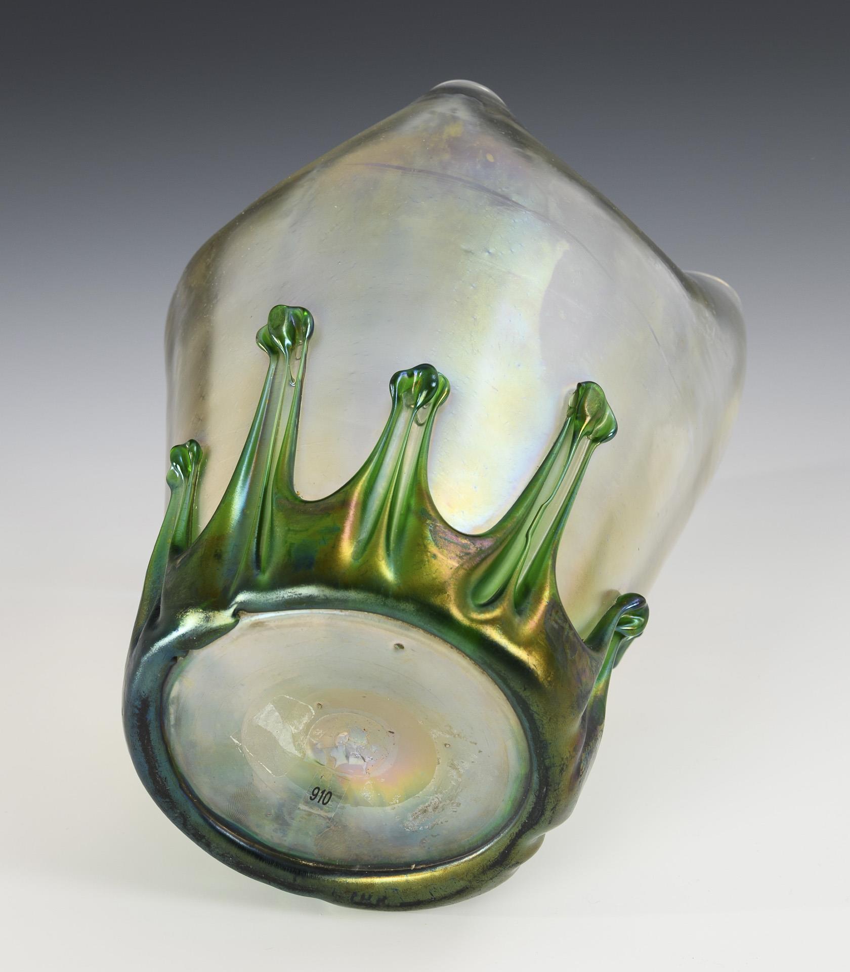 Konische, schwach optisch gerippte Vase mit vierseitig nach innen gedrückter Mündung. Vom Stand her Aufschmelzung aus grünem, abwechselnd zu langen und kurzen Tropfen ausgezogenem Glas. Irisiert.