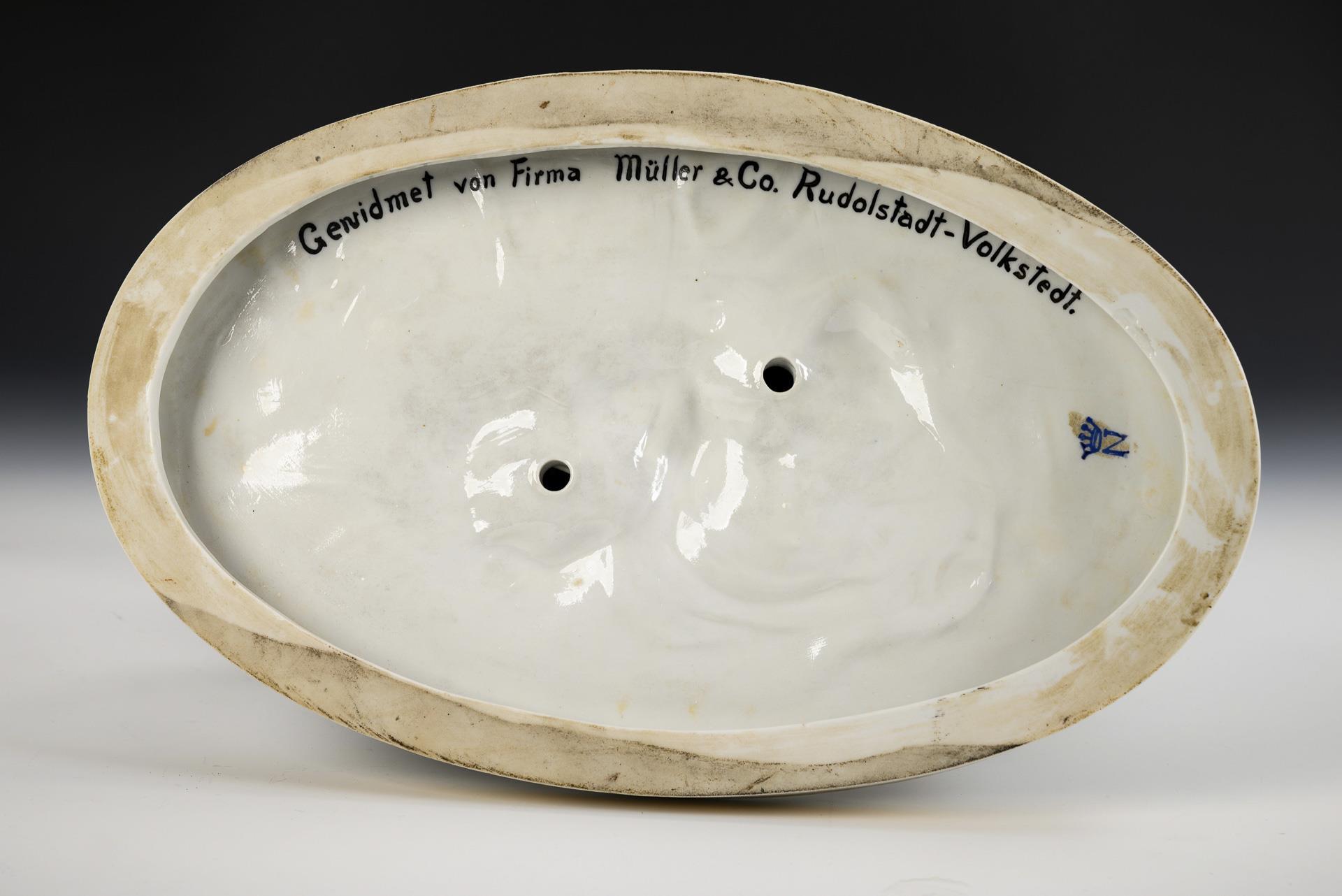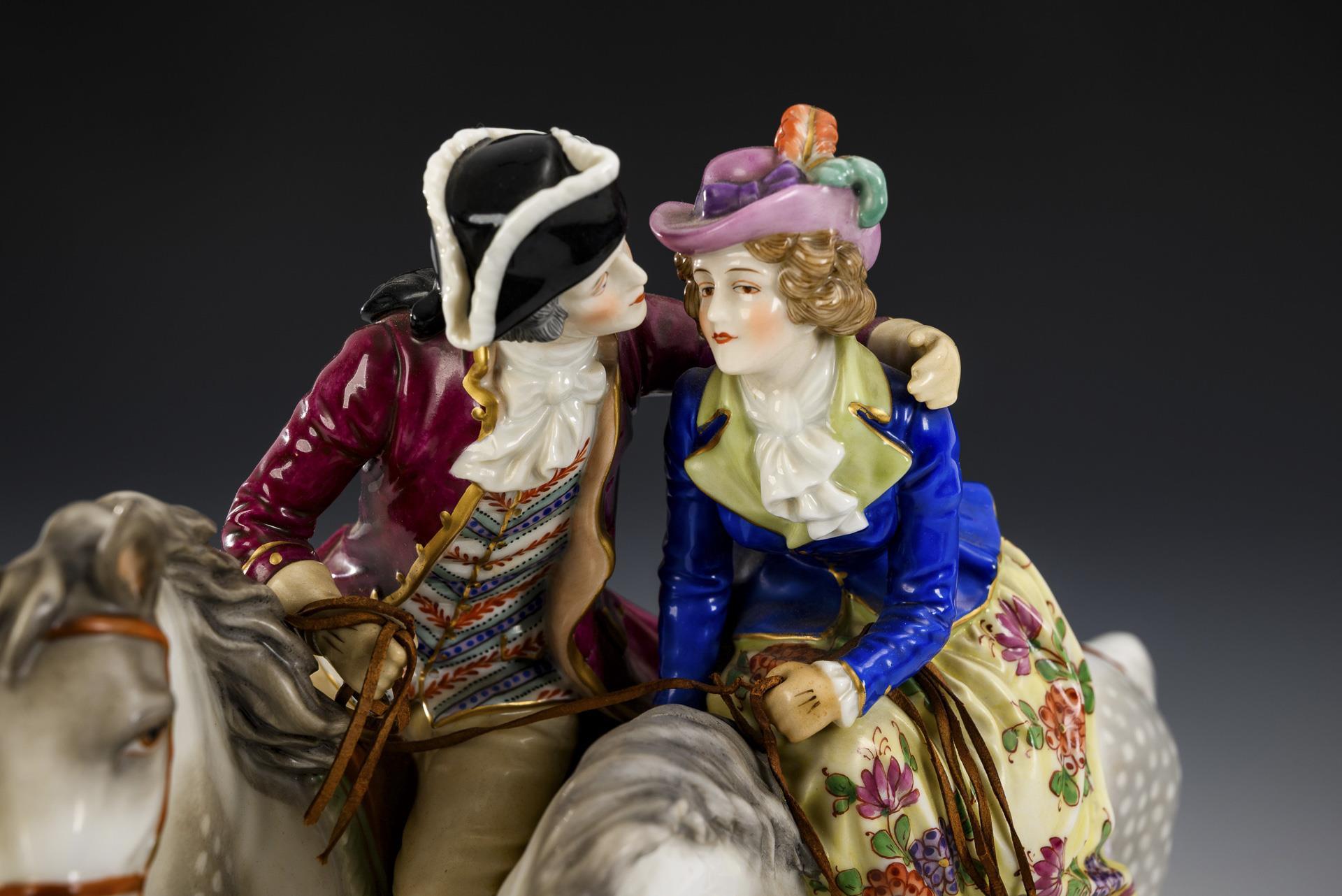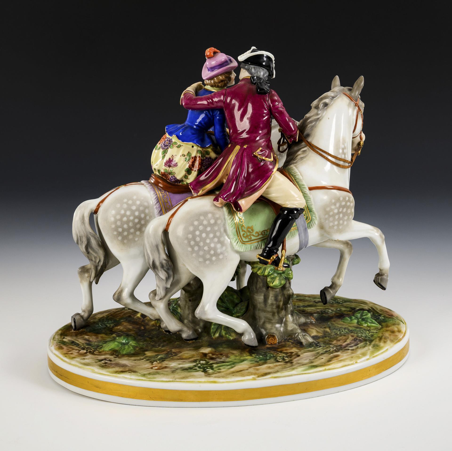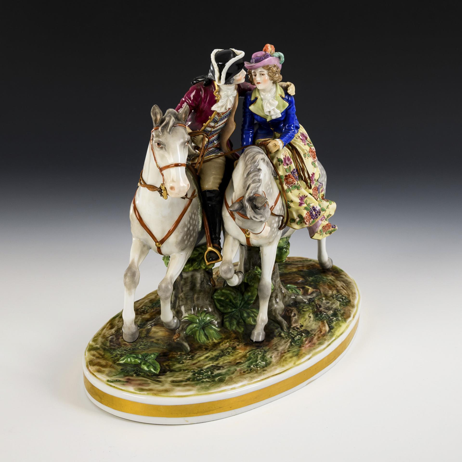 Über einen Natursockel auf zwei Schimmeln reitendes Liebespaar. Unterseitig bezeichnet "Gewidmet von Firma Müller & Co. Rudolstadt-Volkstedt".