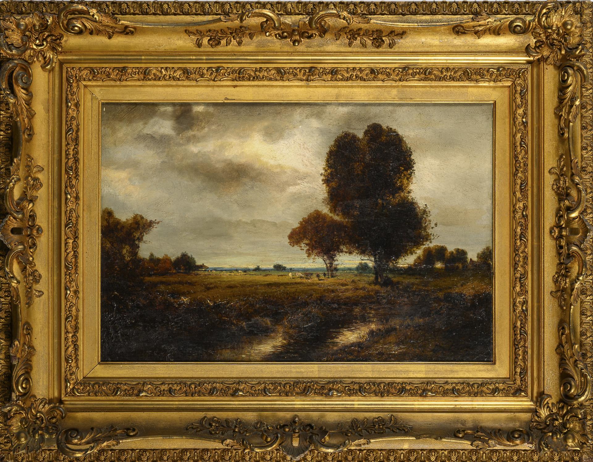 Weite ebene Herbstlandschaft mit einer Viehherde im Sonnenschein nahe einem Haus.