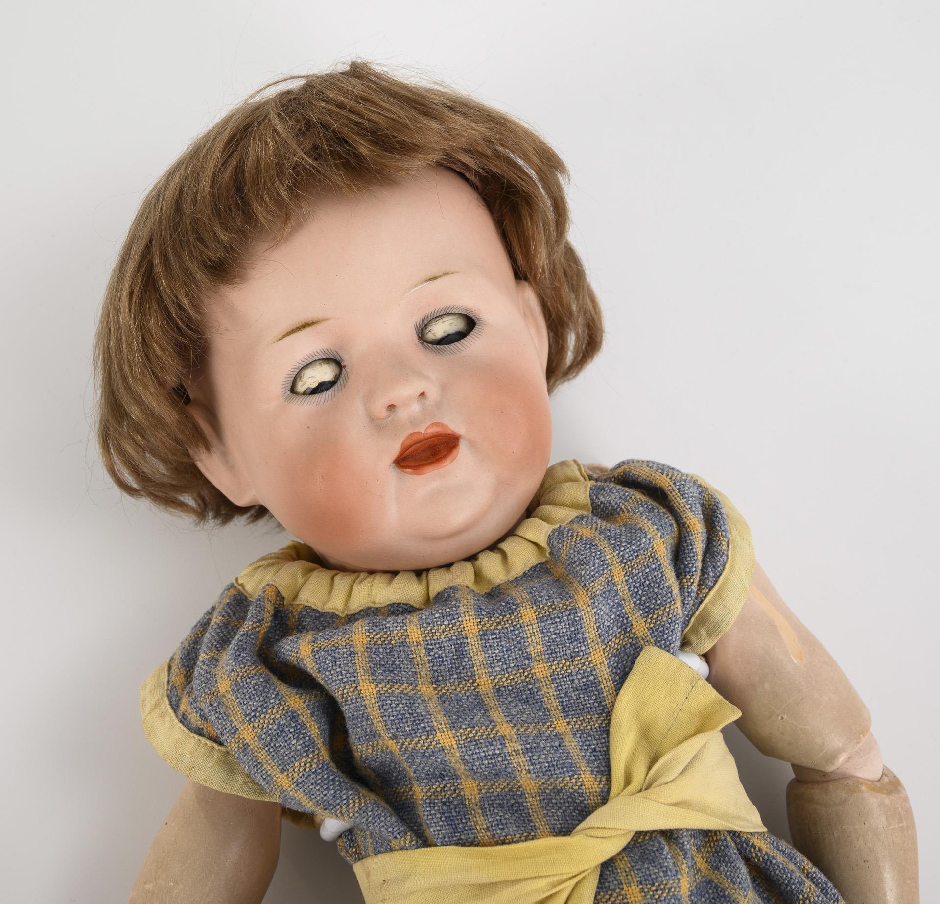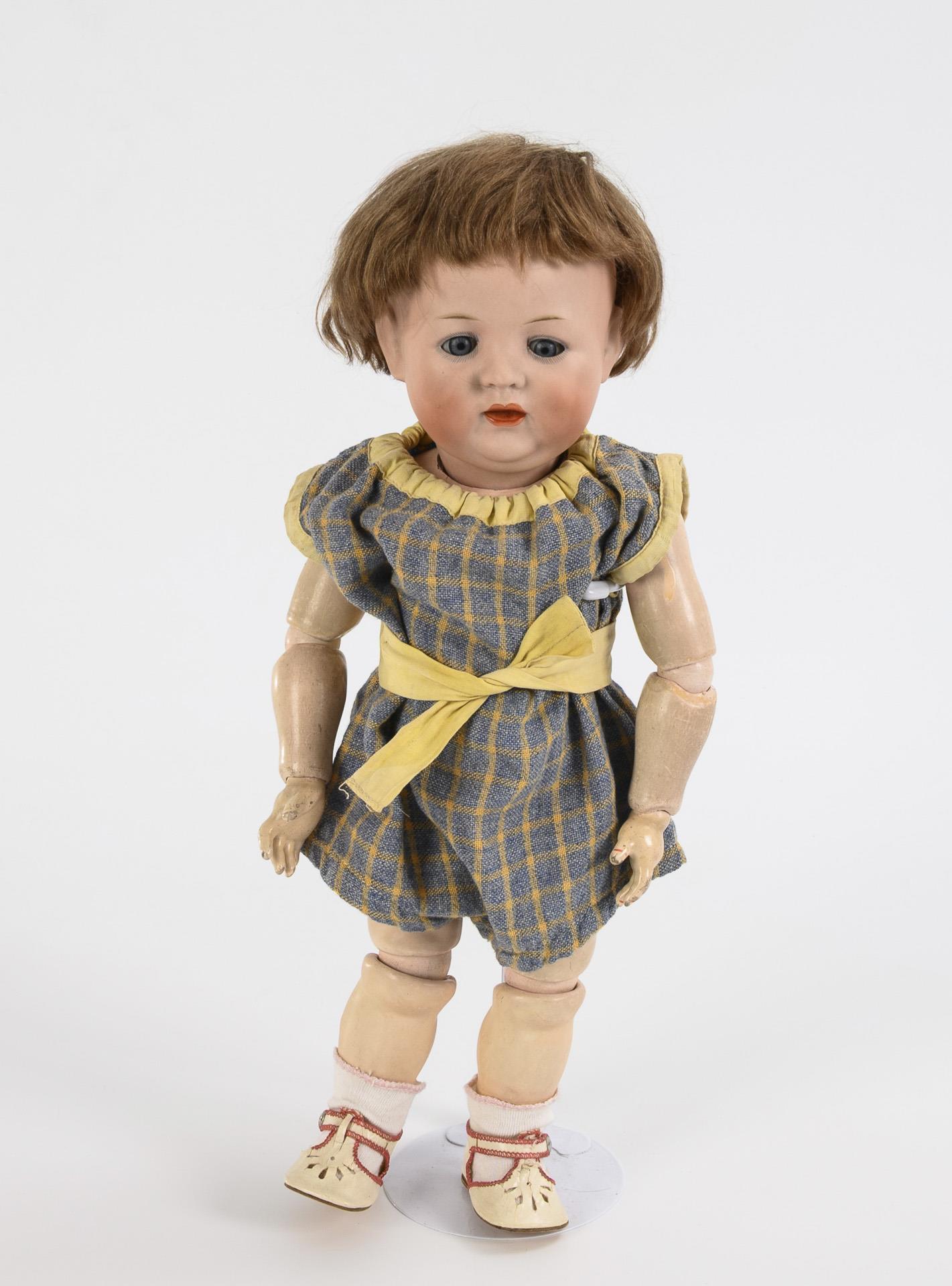 Kurbelkopf, blaue Schlafaugen, offen/geschlossener Mund, mittelblonde Mohairperücke. 17-teiliger Gliederkörper. Karierter Spielanzug, weiße Wachstuchschuhe. Kopf durchleuchtet: ohne Defekte.