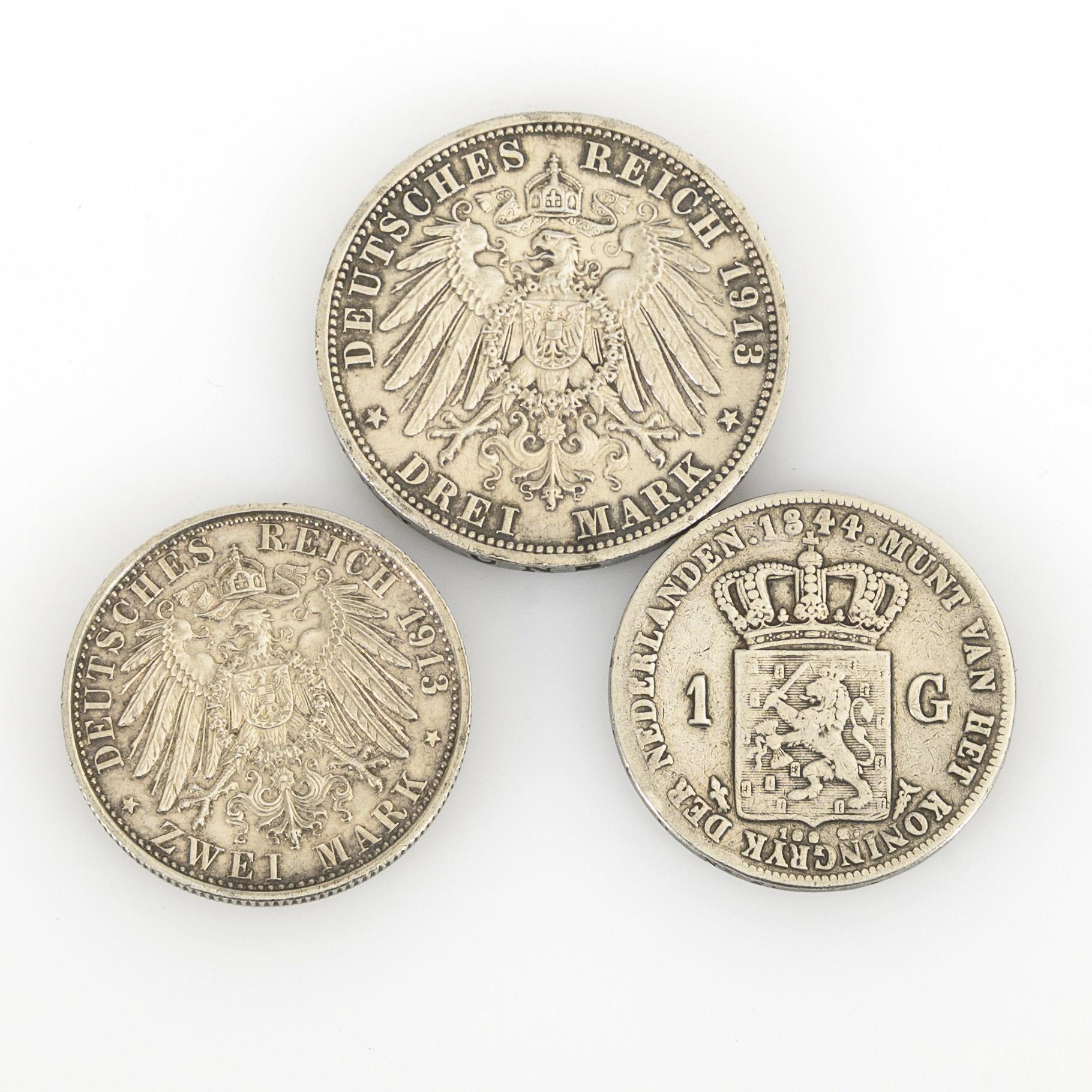 Geldscheine im Wert von 20 Mark bis 500 Millionen Mark, von 1910 - 1923, Deutschland, Inflationsgeld mit Nutzungsspuren. / 2 Silbermünzen: 3 und 2 Mark, 1913, Deutsches Reich, "Wilhelm II. Deutscher Kaiser König von Preussen, 1888 - 1913", in Uniform, zusammen 27,78 g Silber. / 1 Gulden, 1844, "Willem II. Koning der Ned. G.H.V.L.", "Munt Van Het Koningryk Der Nederlanden", 9,75 g Silber.