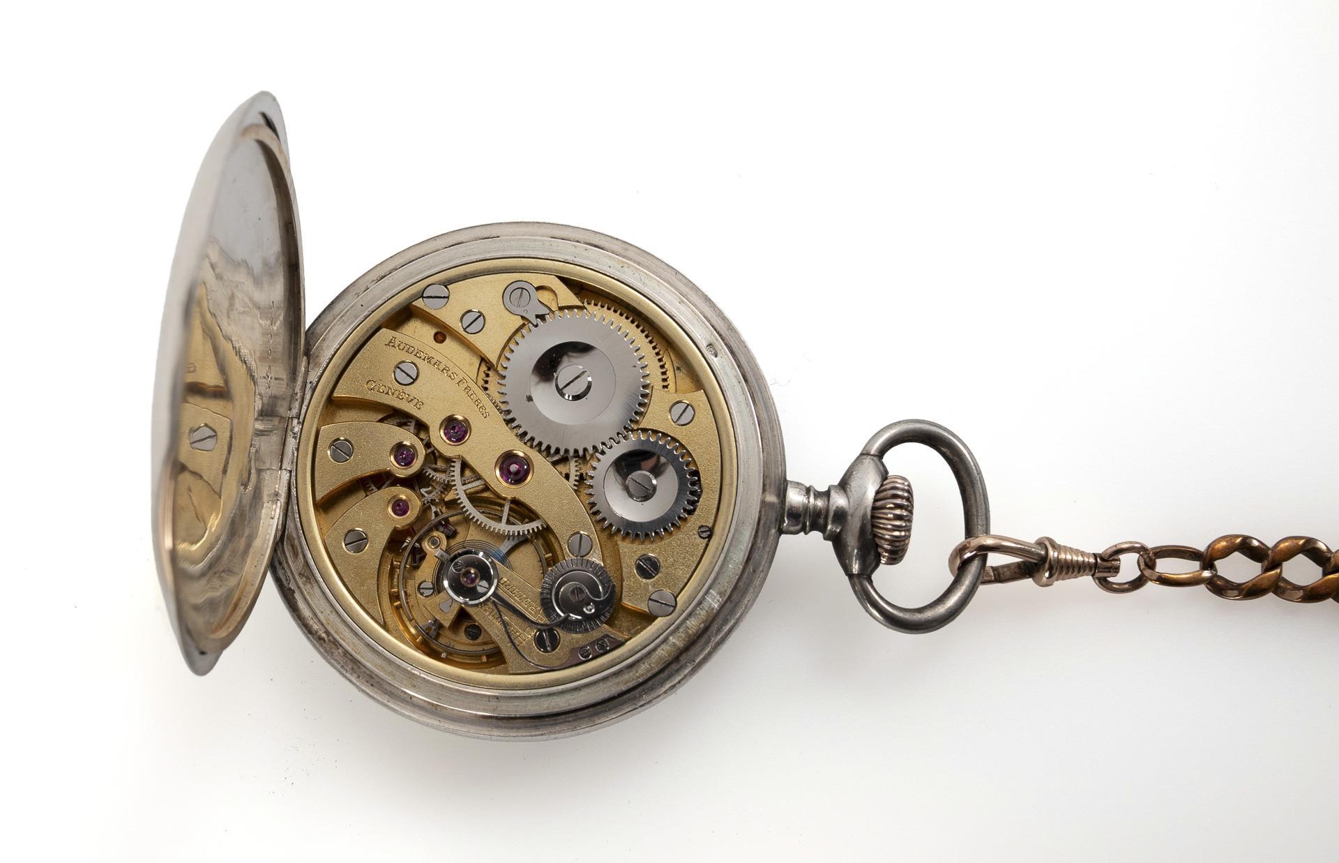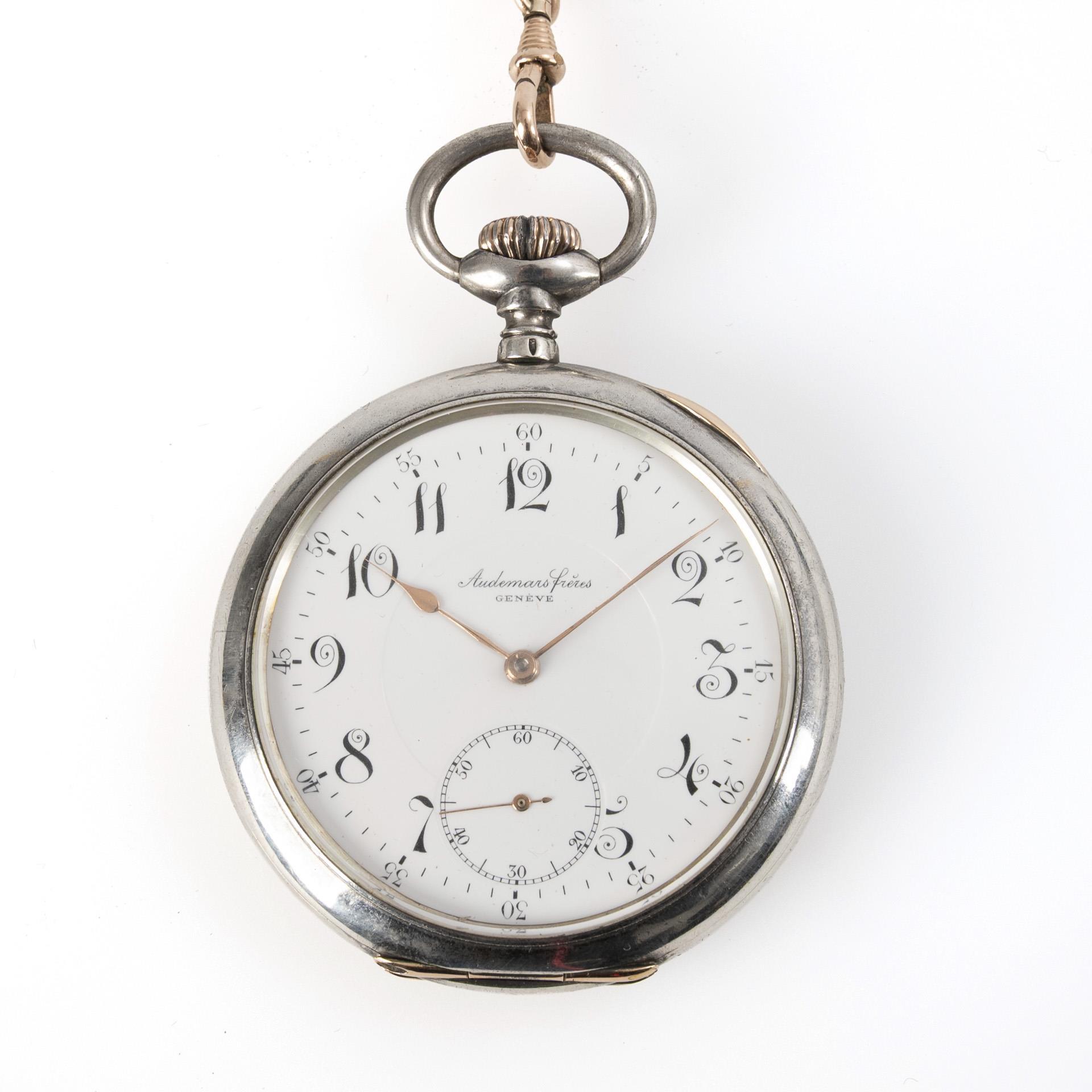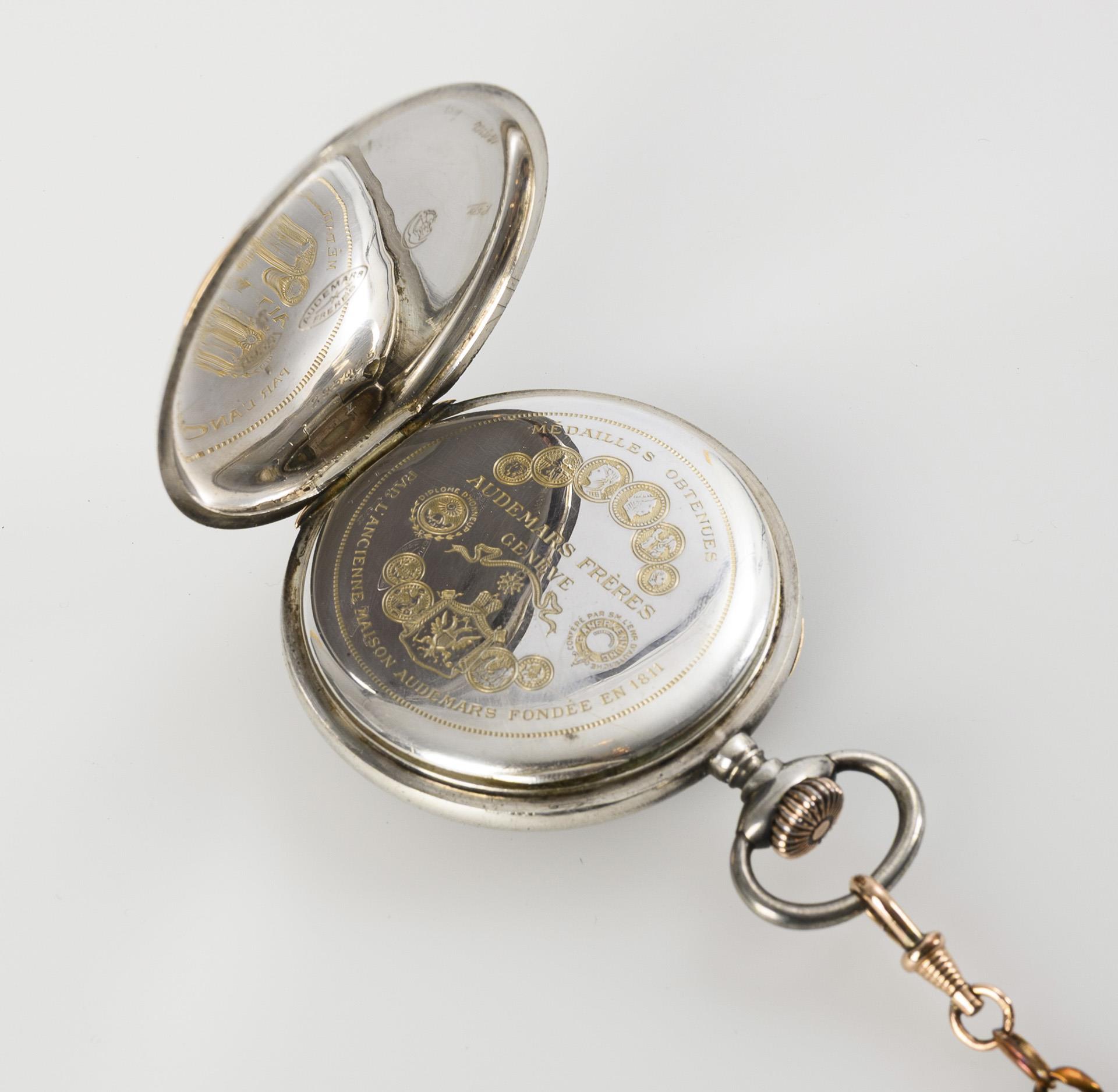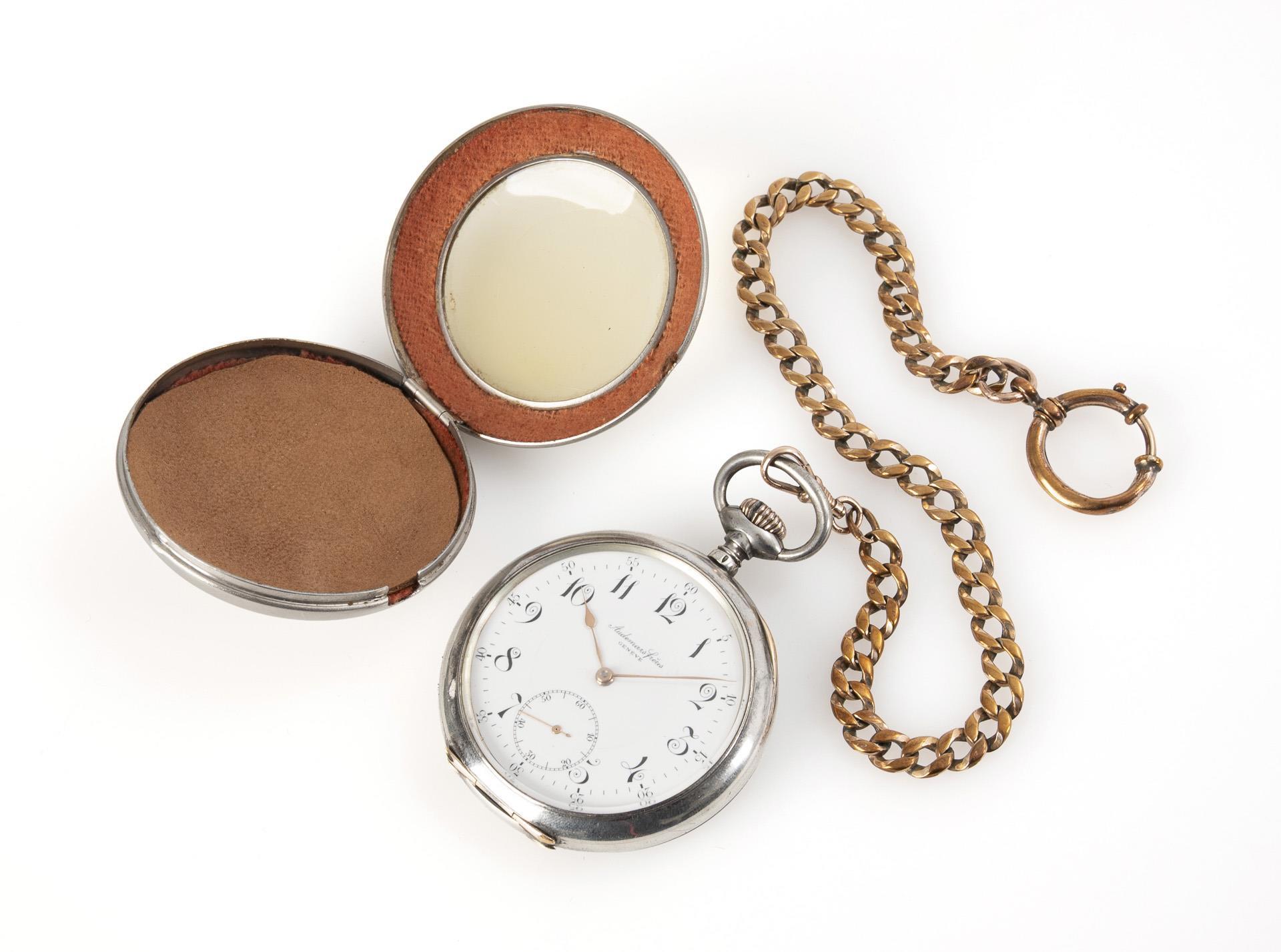 Silberne Taschenuhr mit Uhrenmantel und Uhrenkette. Audemars Frères, Genf.