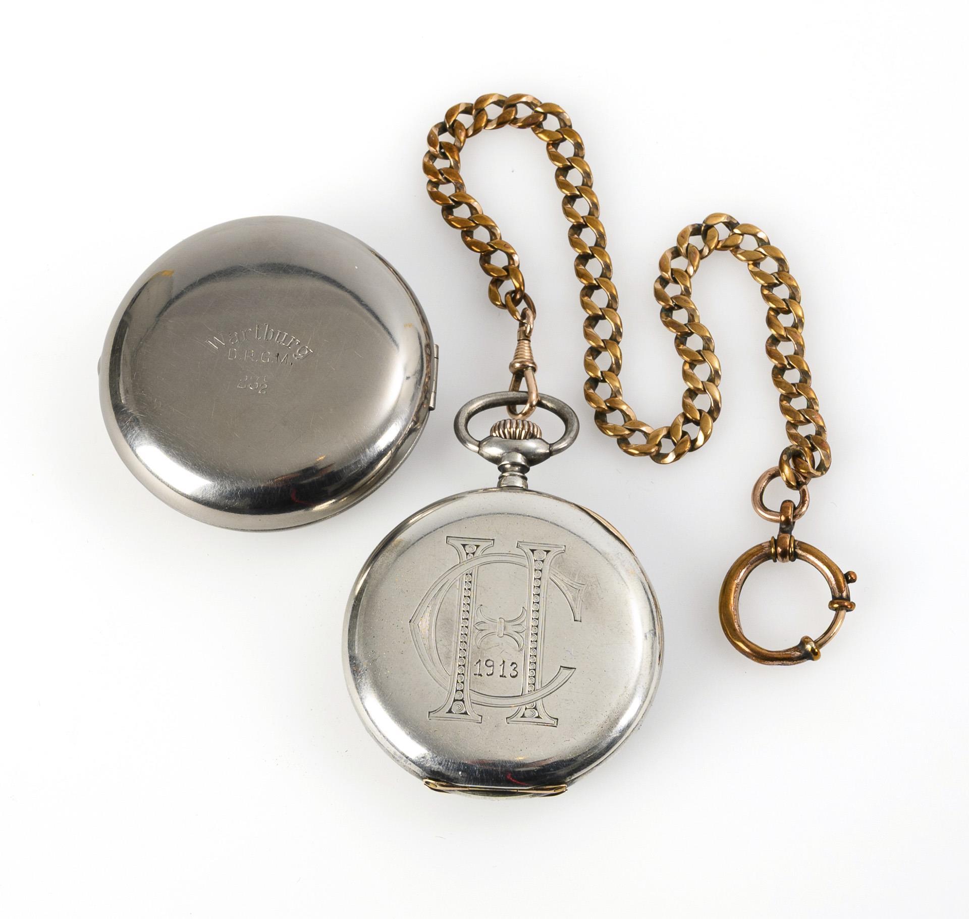 Glattes Lépine-Gehäuse mit ligiertem Monogramm "CH" und Datumsgravur "1913", in Metall-Uhrengehäuse mit vergilbtem Kunststoffglas, verso graviert "Wartburg D.R.G.M. 23 1/2". An vergoldeter Gliederkette mit Karabiner und Federring.