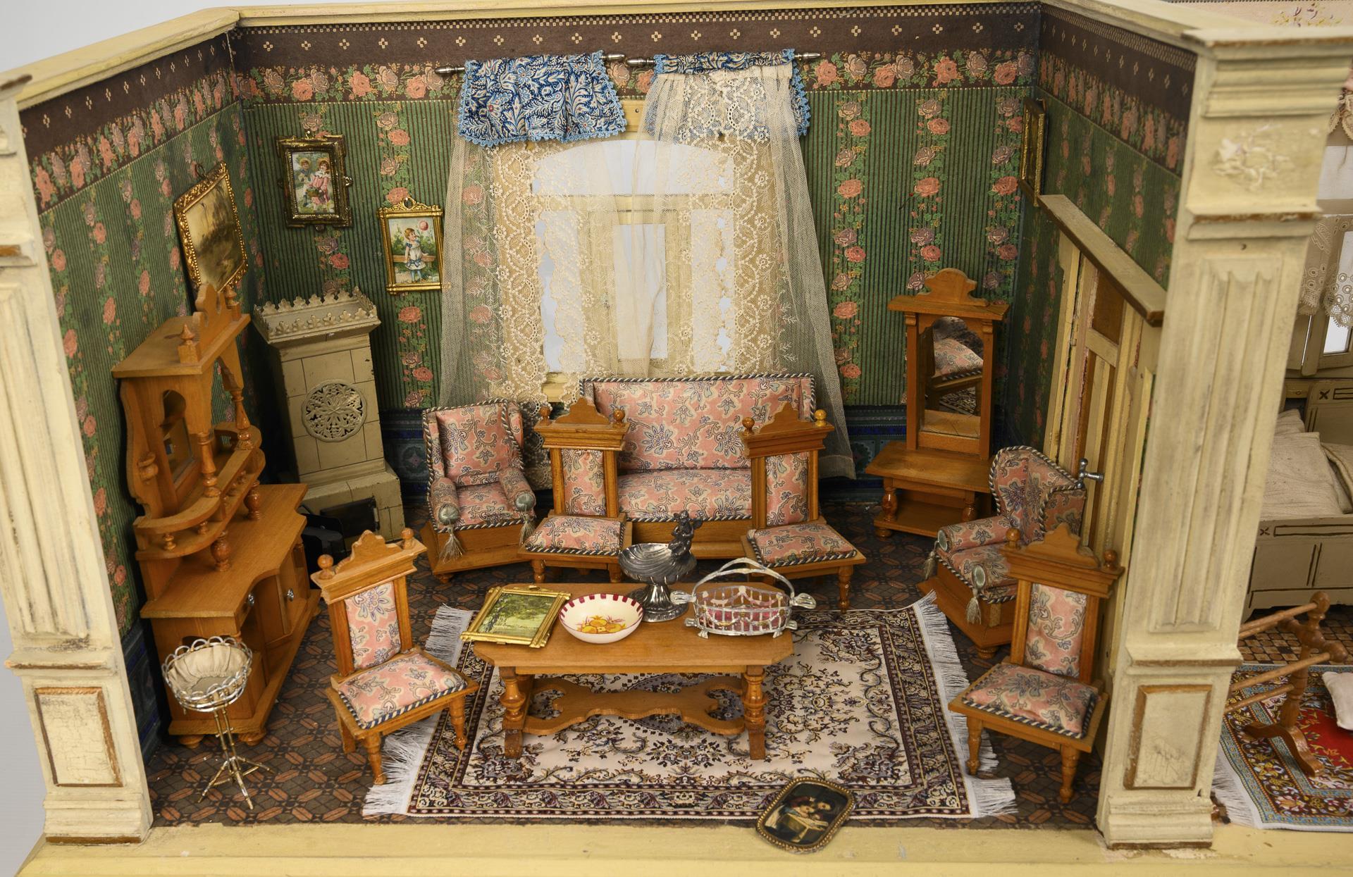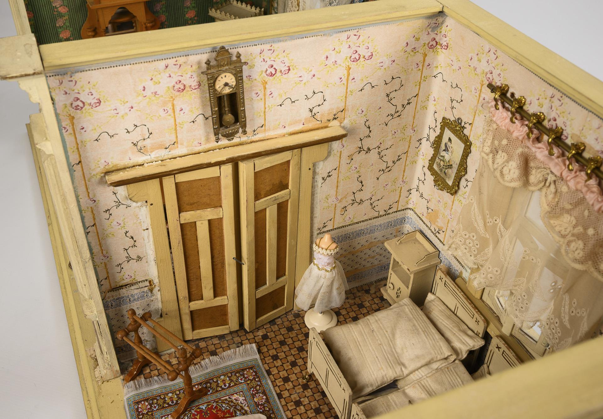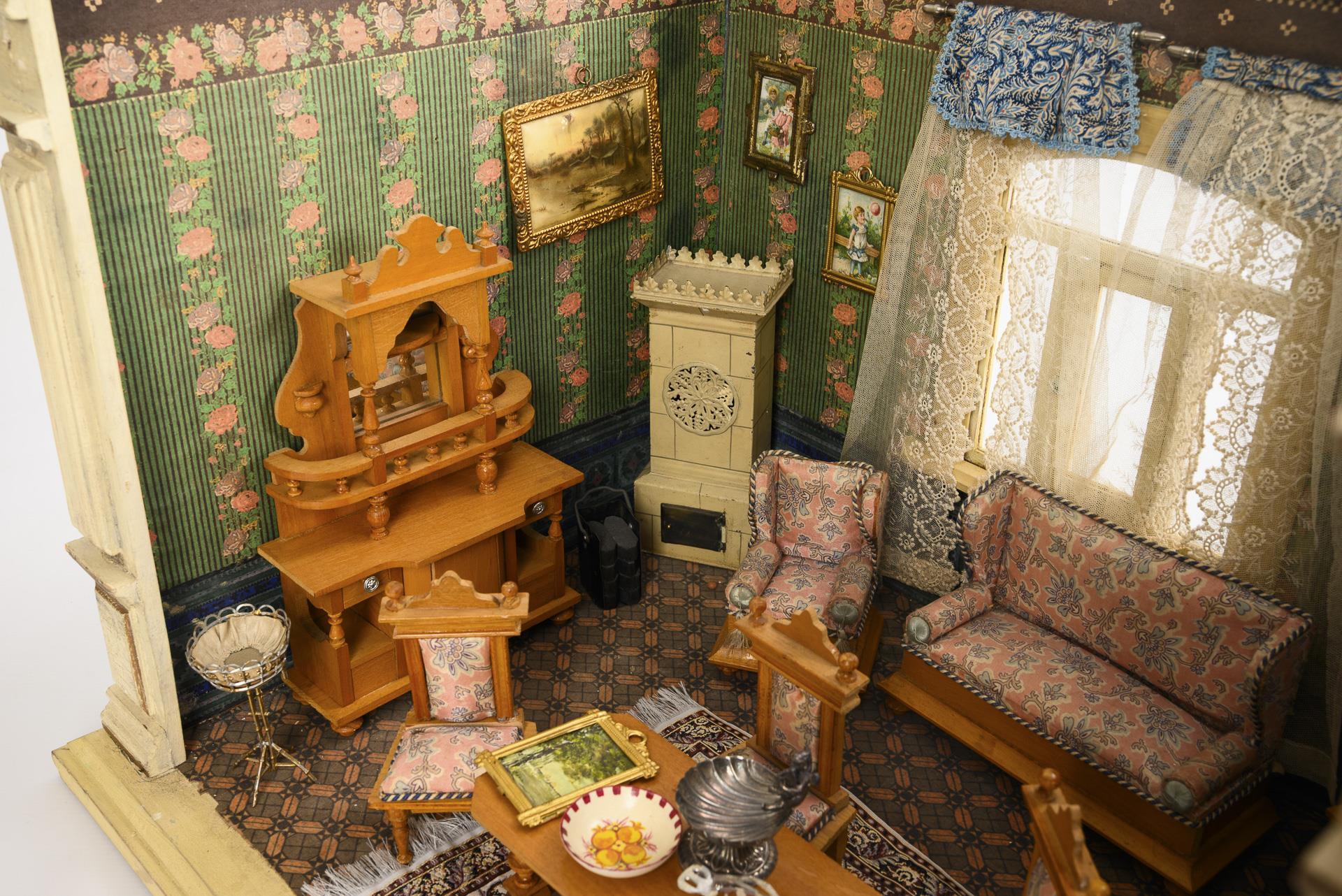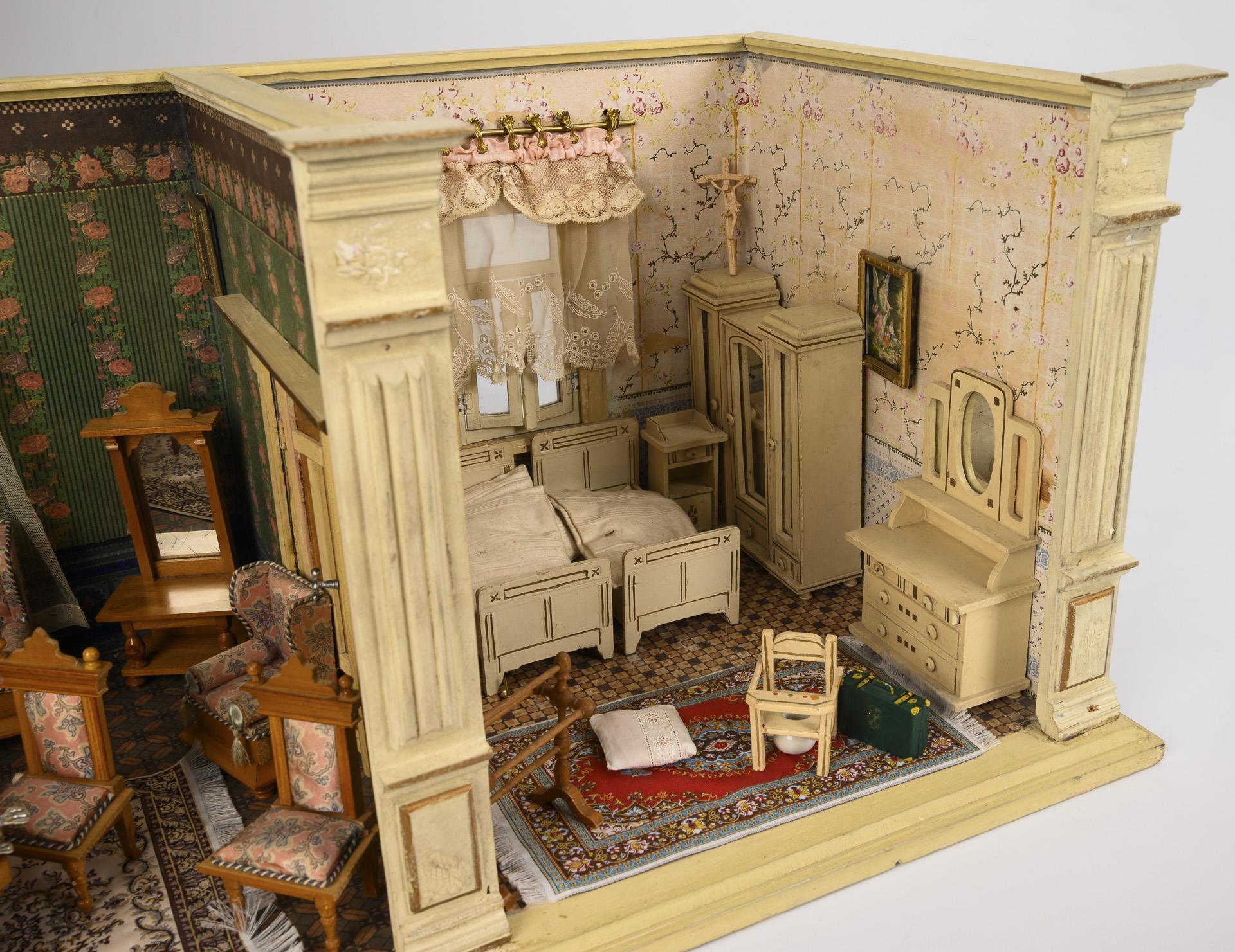 2-Raum-Gehäuse mit gründerzeitlich gestalteten weißen Frontlisenen, 2 verglasten Fenstern, Gardinen und schöner Doppel-Verbindungstür. Eingerichtet als Wohnstube mit hellen Möbeln und weißem Kachelofen aus Blech, sowie als Schlafzimmer mit weißen Möbeln mit Goldkonturen. Bespielt, mit Altersspuren.