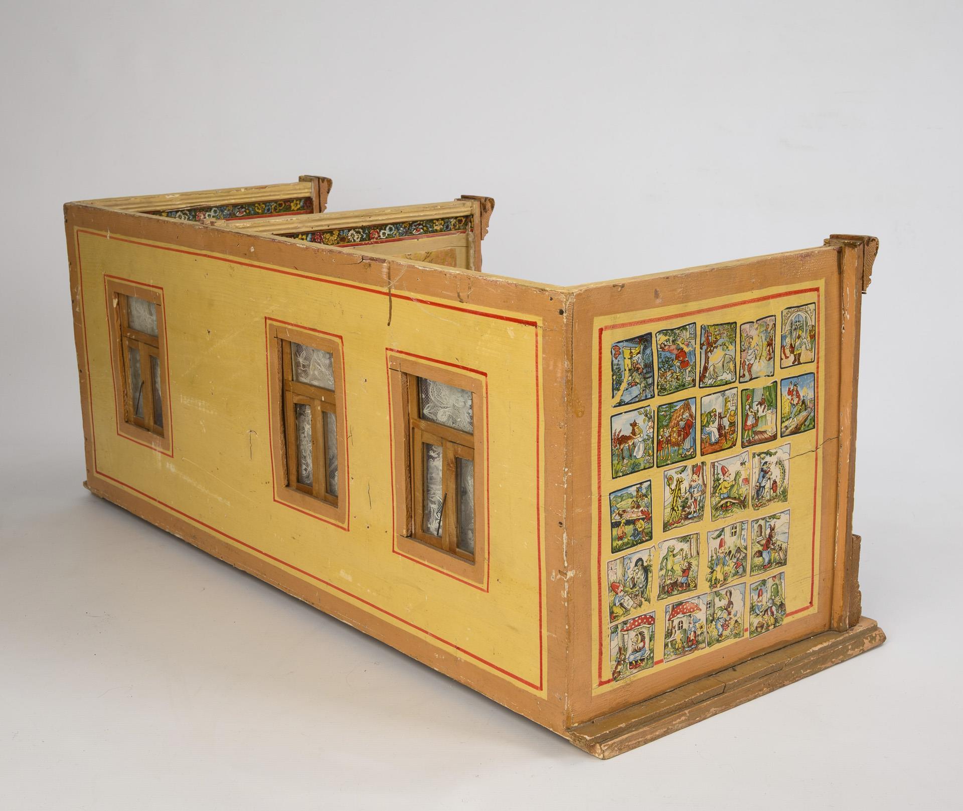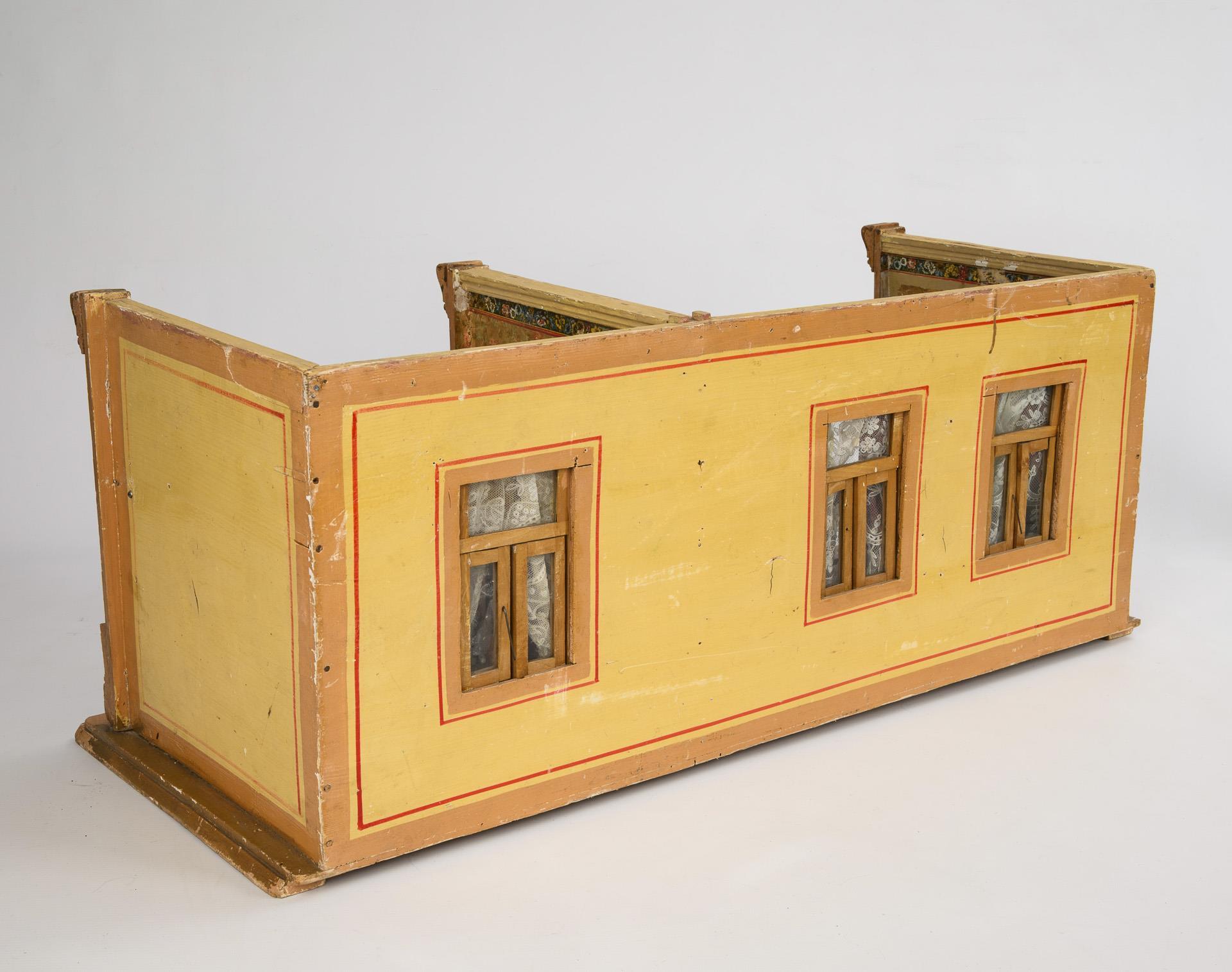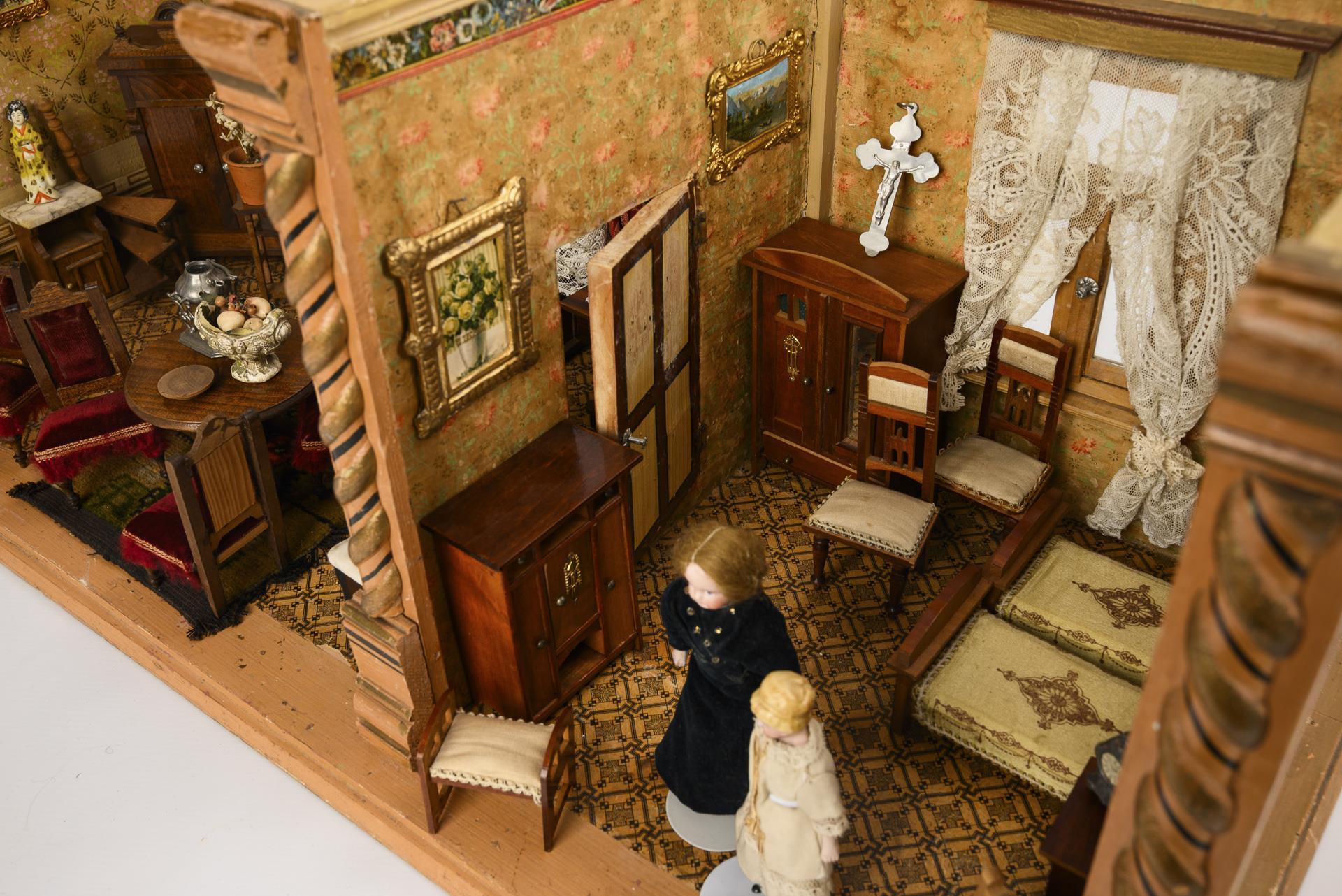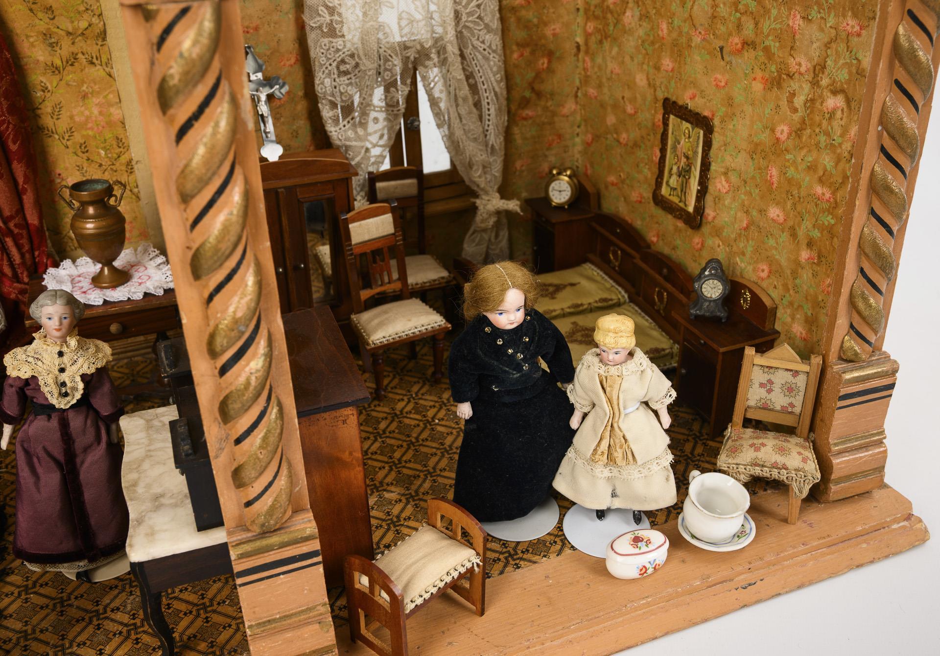 2-Raum Gehäuse mit gedrehten Frontsäulen, 3 verglasten Fenstern, Gardinen und Zwischentür. Eingerichtet als Stube und Schlafzimmer mit dunklen Möbeln. Dazu 4 Püppchen. Altersspuren, kleine Defekte. Wasserschaden im Schlafzimmer.