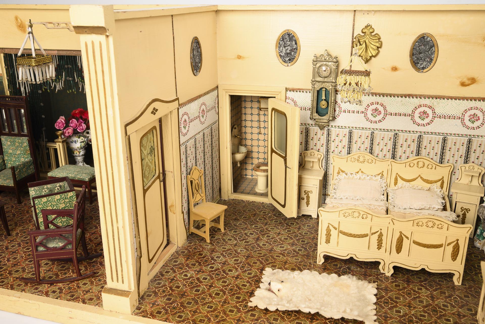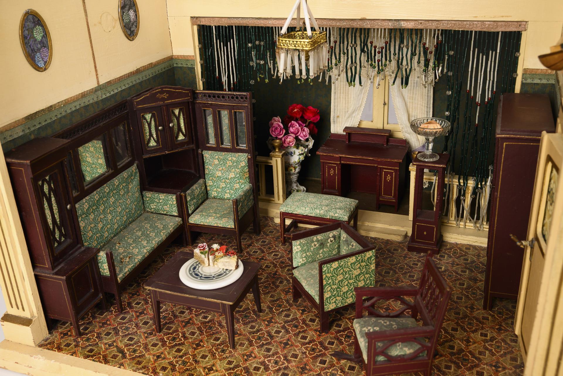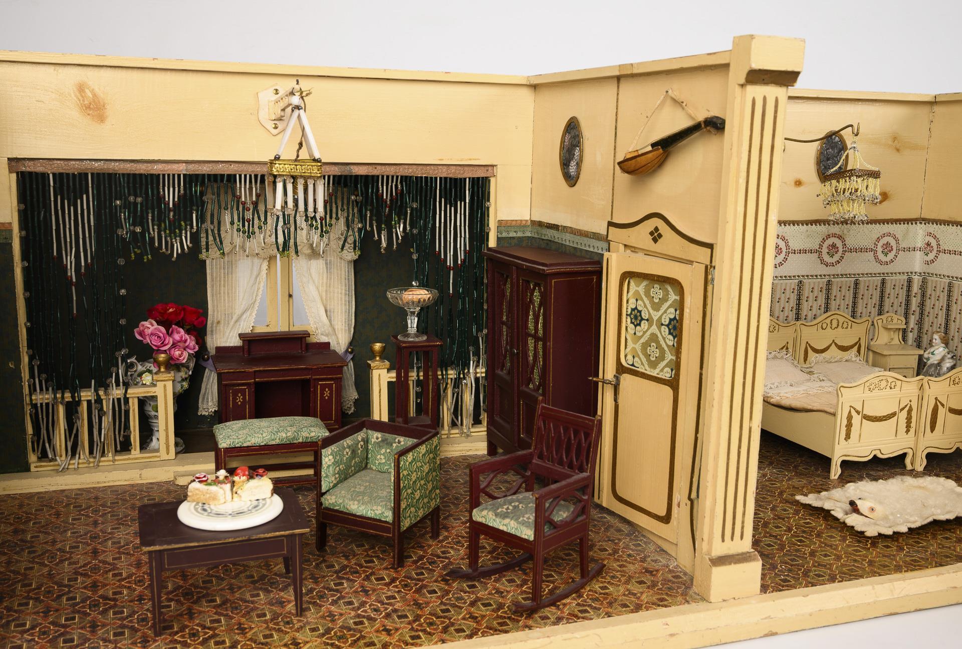 2-Raum-Gehäuse mit Verbindungstür, Erker, verglastem Fenster, Gardine und kleiner Toilette im Schlafzimmer. Wohnstube mit dunklen Möbeln eingerichtet, im Schlafzimmer cremeweiße Möbel mit geprägten Verzierungen und Goldbronzierungen. Leichte Altersspuren.