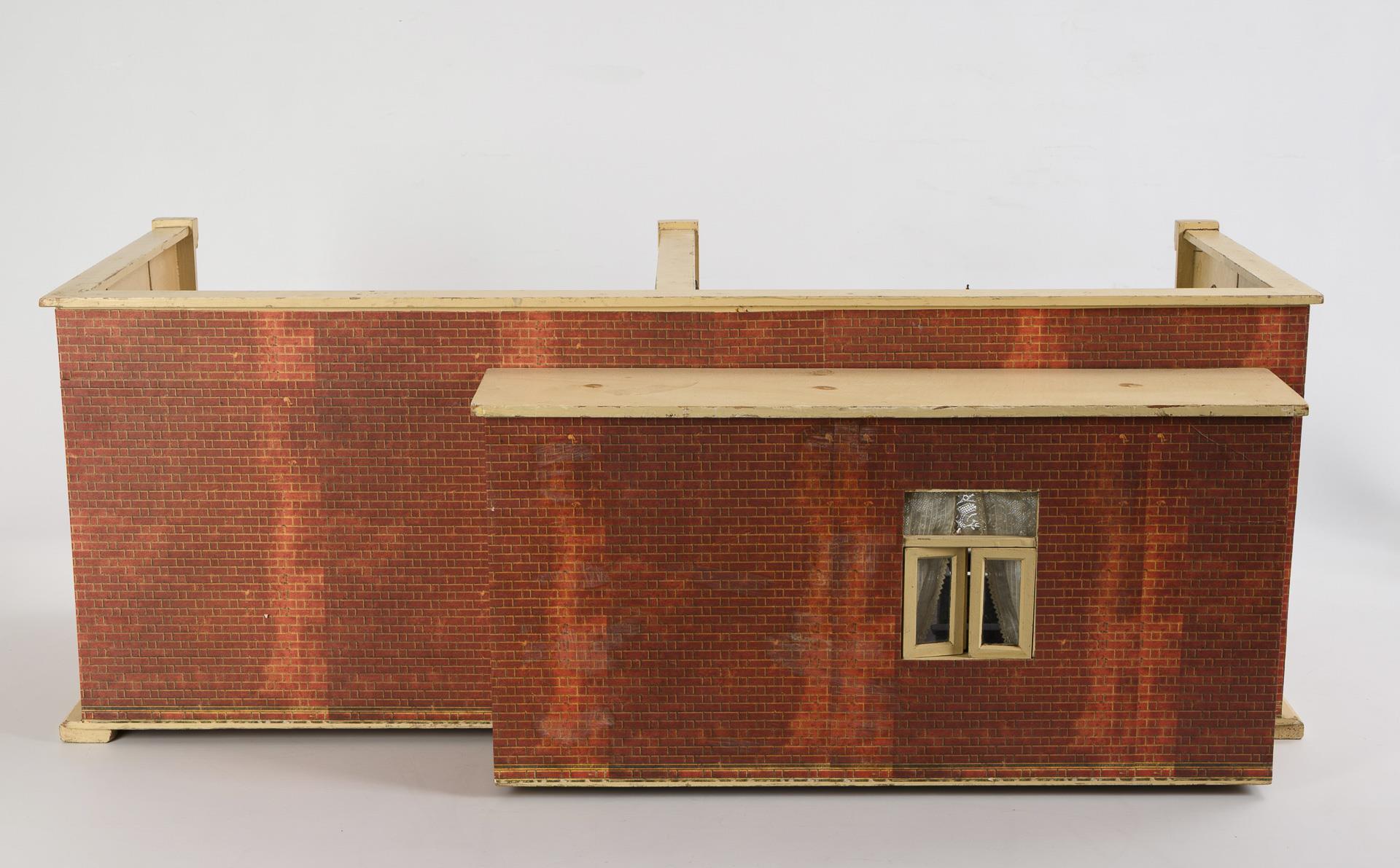Holz, außen mit Ziegelpapier beklebt, innen cremeweiß gestrichen, mit halbhohen Tapeten. 41,5 x 110,5 x 42 cm.