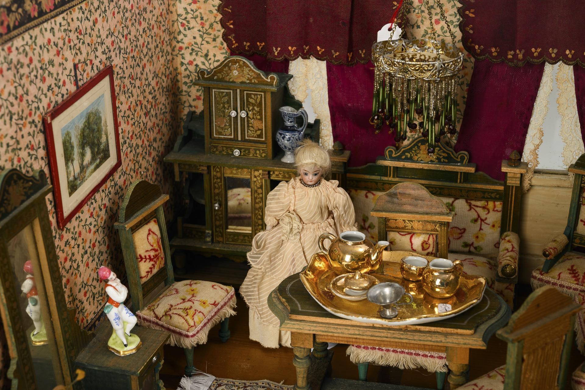Gehäuse mit 3 Fenstern, Gardinen und 2 Kronleuchtern. Eingerichtet als Wohnzimmer mit weinroten Gardinen und grünen Möbeln und als Schlafzimmer mit Eichenmöbeln. Dazu 5 Püppchen. Bespielt, Altersspuren.
