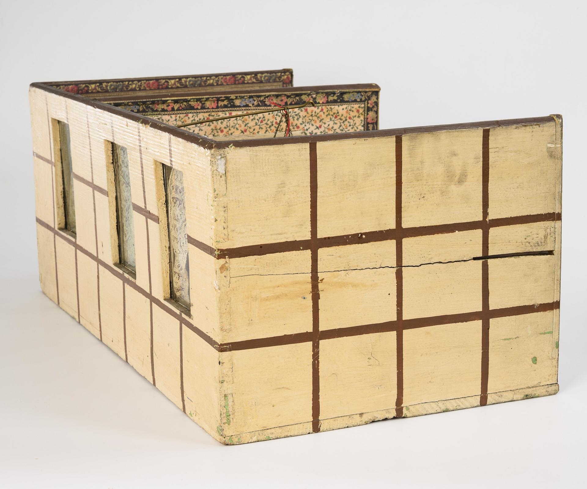 Holz, außen gelblich gestrichen mit aufgemaltem Fachwerk, innen wohl alt tapeziert. 31 x 72 x 39 cm.