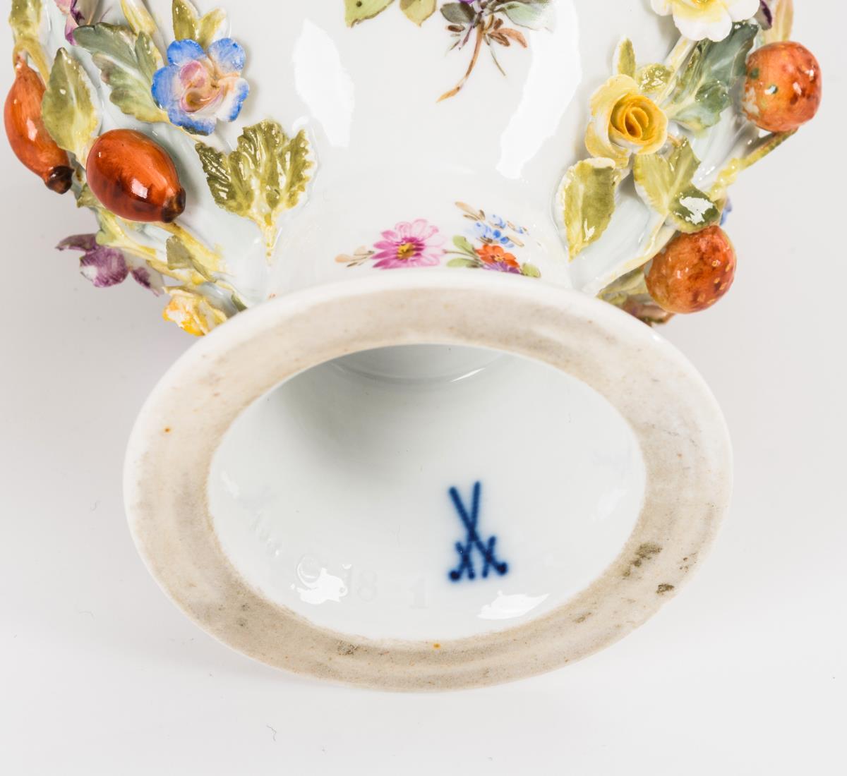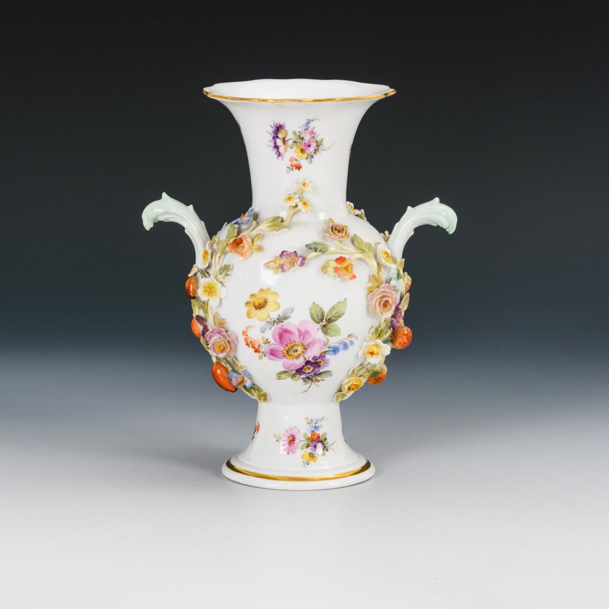 Balustervase mit zwei Blatthenkeln, Blumenmalerei und reichem Blüten- und Fruchtbelag. Bestoßungen am Belag.