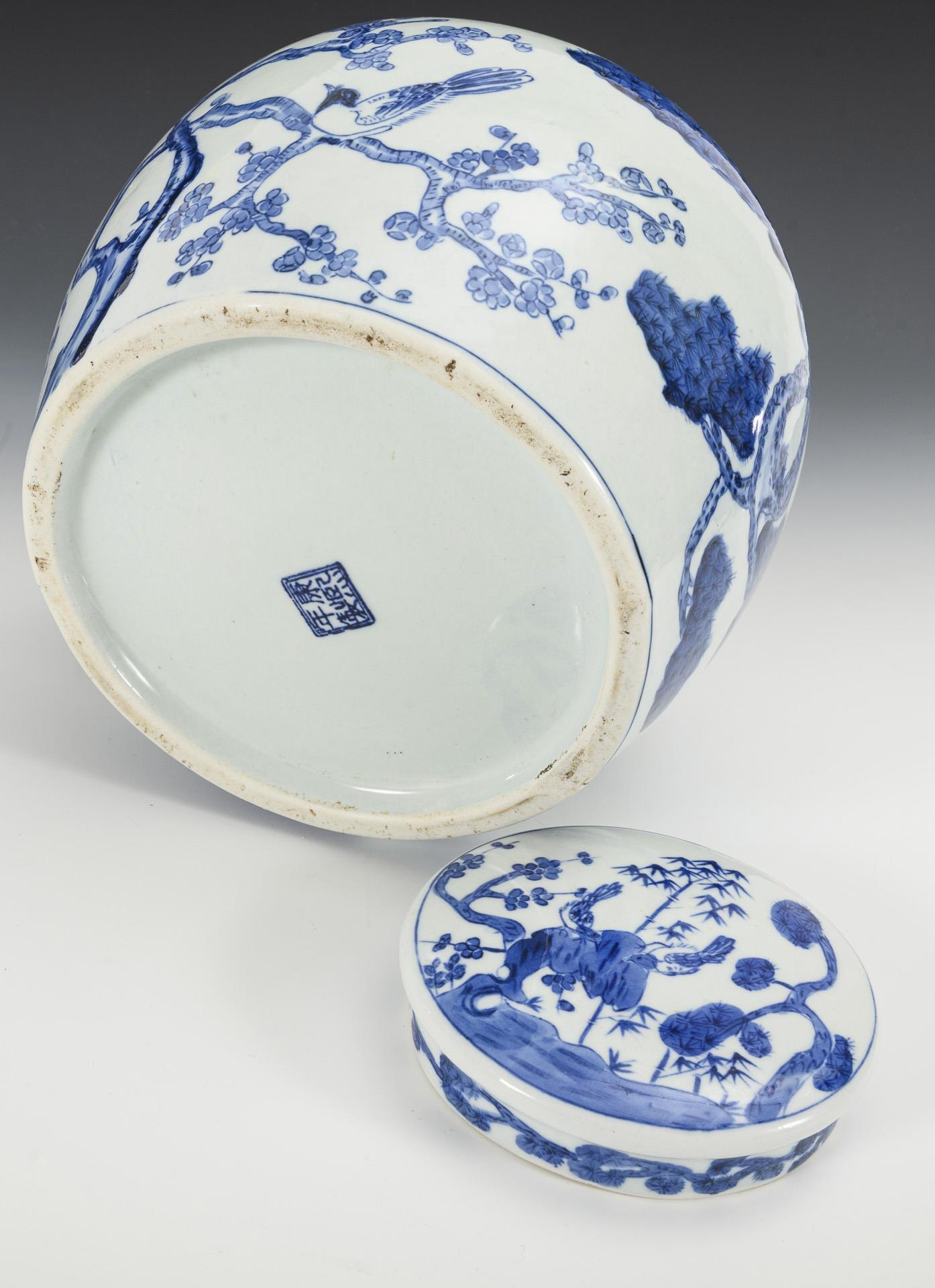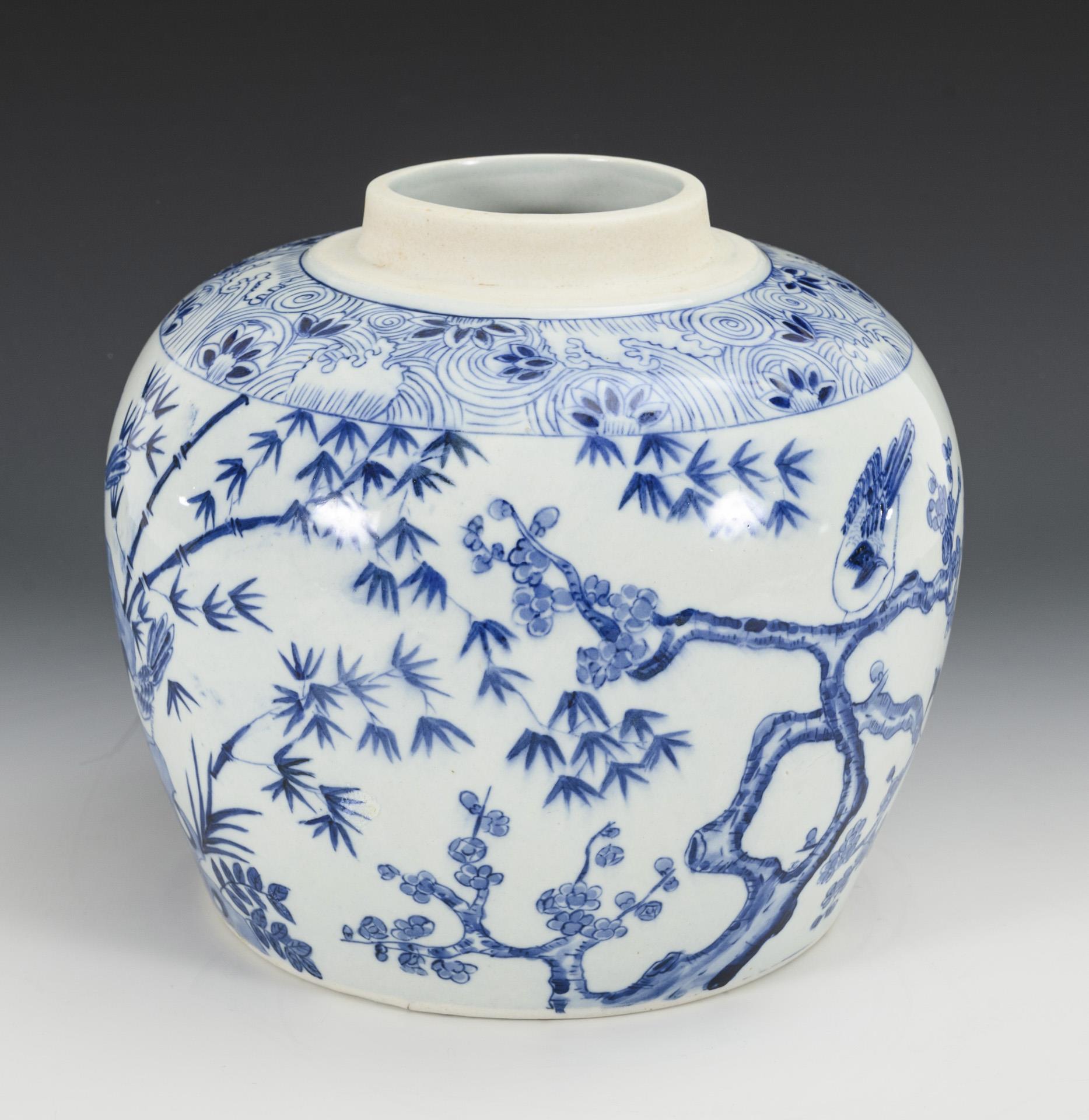 Unterglasur-Blaumalerei mit Kiefer-Bambus-Pflaumenblüten-Dekor. Flacher Deckel mit ähnlichem Dekor. Eine kleine Stelle mit 'ausgeblühter' Glasur.