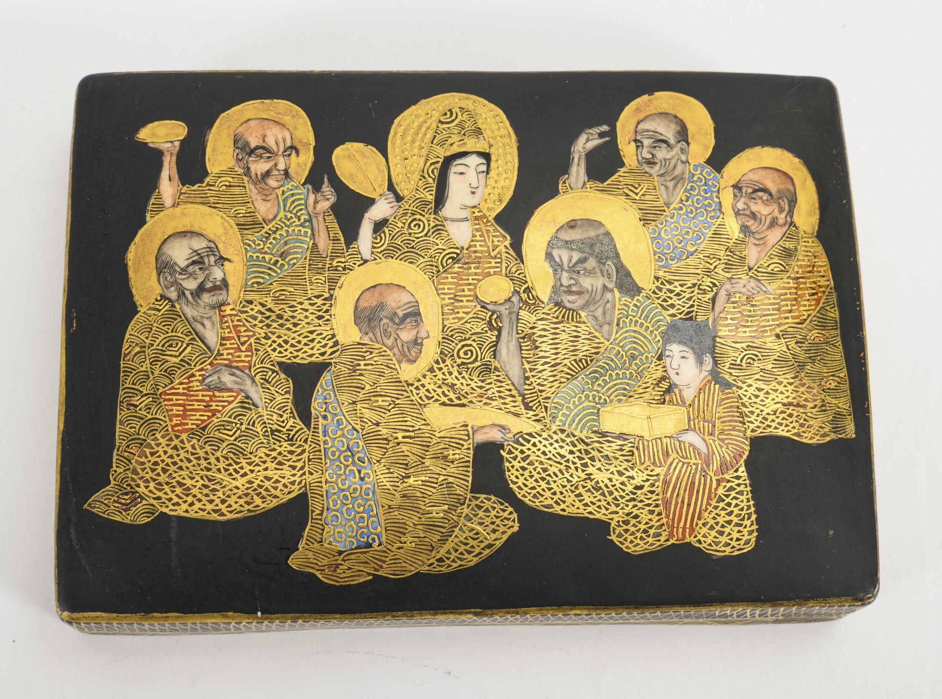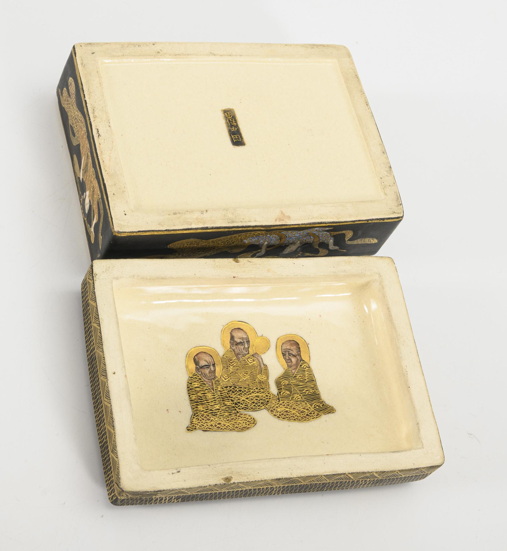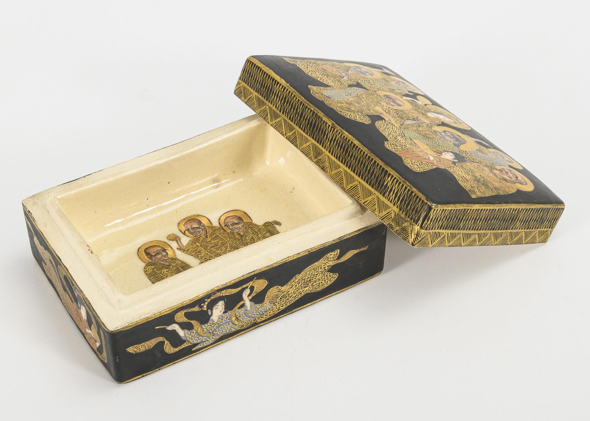 Goldmalerei auf dunklem Grund, innen helle Glasur. Deckel mit den Acht Unsterblichen. Im Innendeckel und Innenboden je drei sitzende Heiligenfiguren. Außenwandung mit weiblichen Figuren. Feine Malerei.