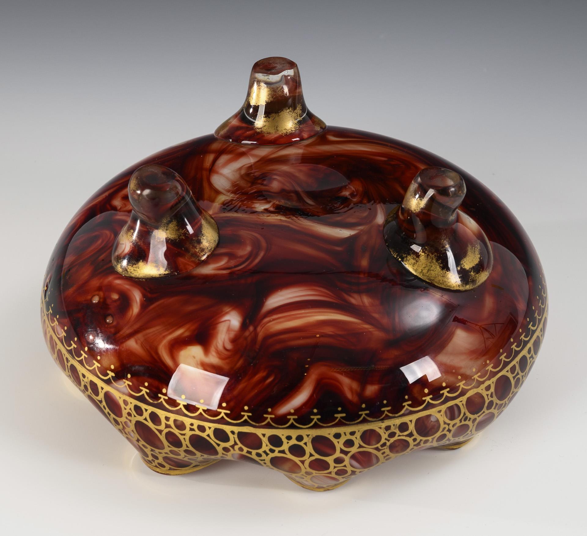 Weißes, farblos überfangenes Opalglas mit fein aufgesponnenen, marmoriert verzogenen karminroten Glasfäden in der Zwischenschicht; Goldstaffage. H 9,5 cm.