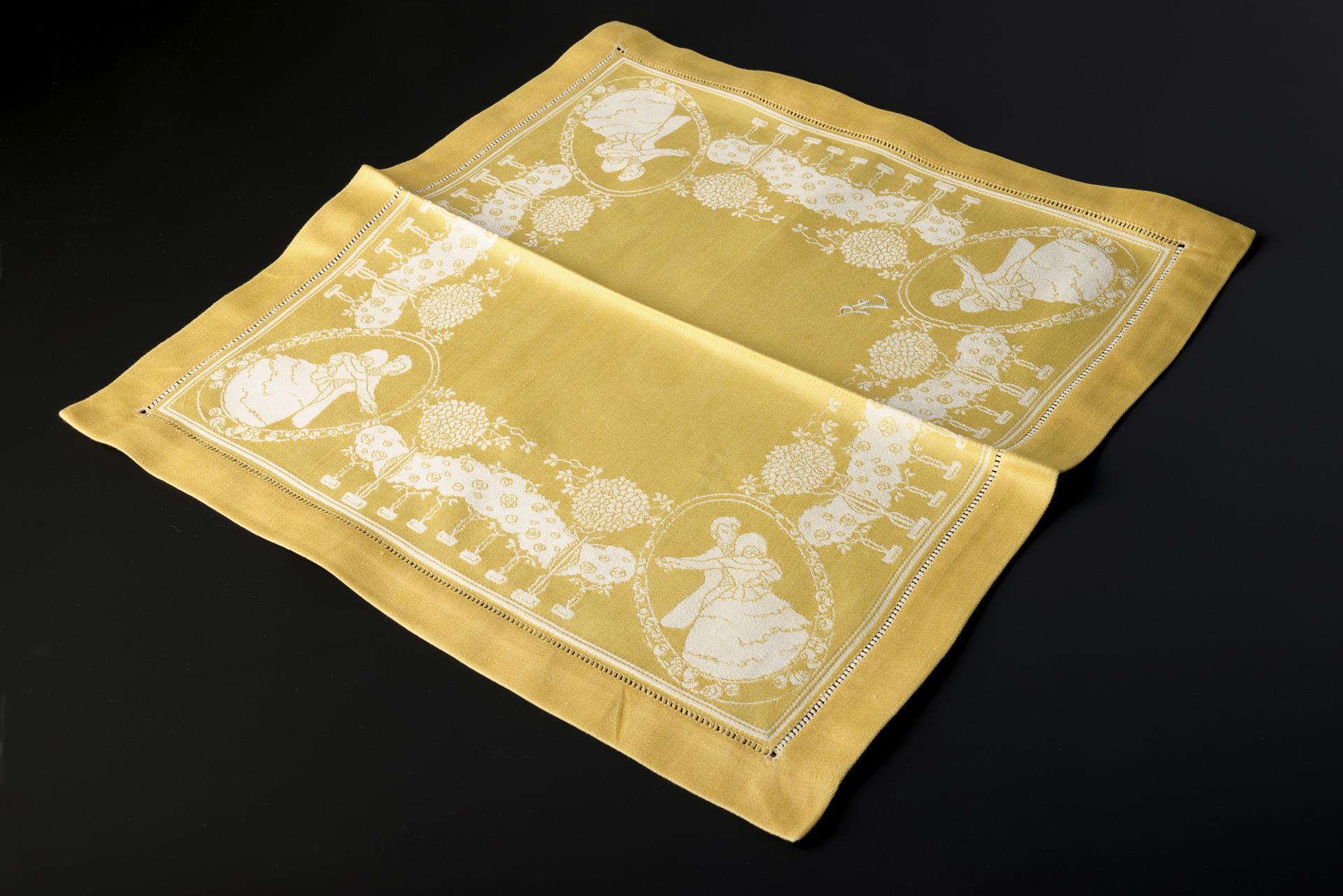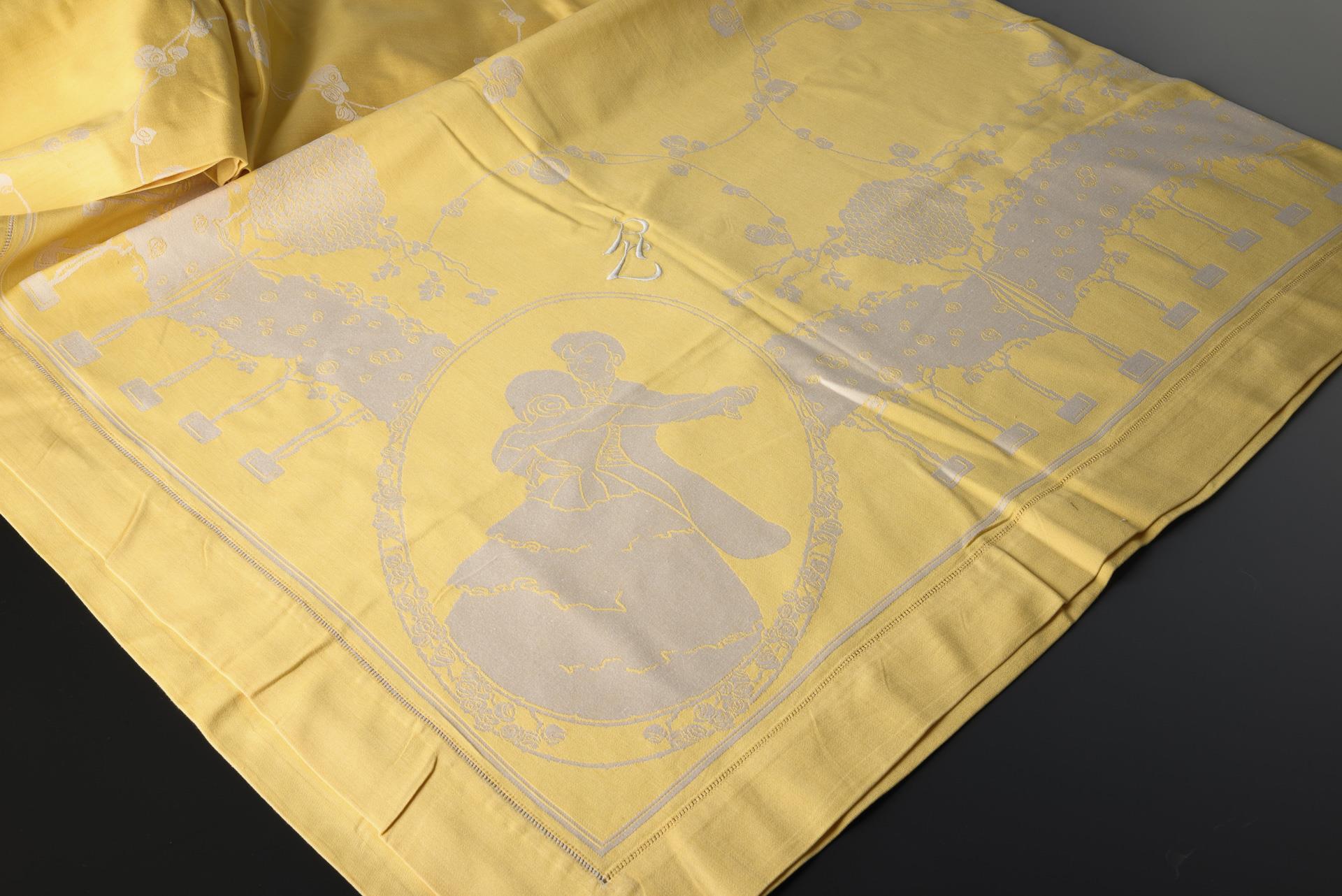 Gelbes Jugendstil-Tafeltuch mit 12 Servietten gleicher Ausführung mit umlaufender Bordüre, diese ein Gartenmotiv sowie jeweils in den Ecken Kartuschen mit einem tanzenden Paar zeigend. Der Mittelteil der Decke mit einem sich wiederholenden Muster aus sich überlappenden, rosengeschmückten Kreisformen. Alle Teile mit weiß gesticktem Monogramm "RL".