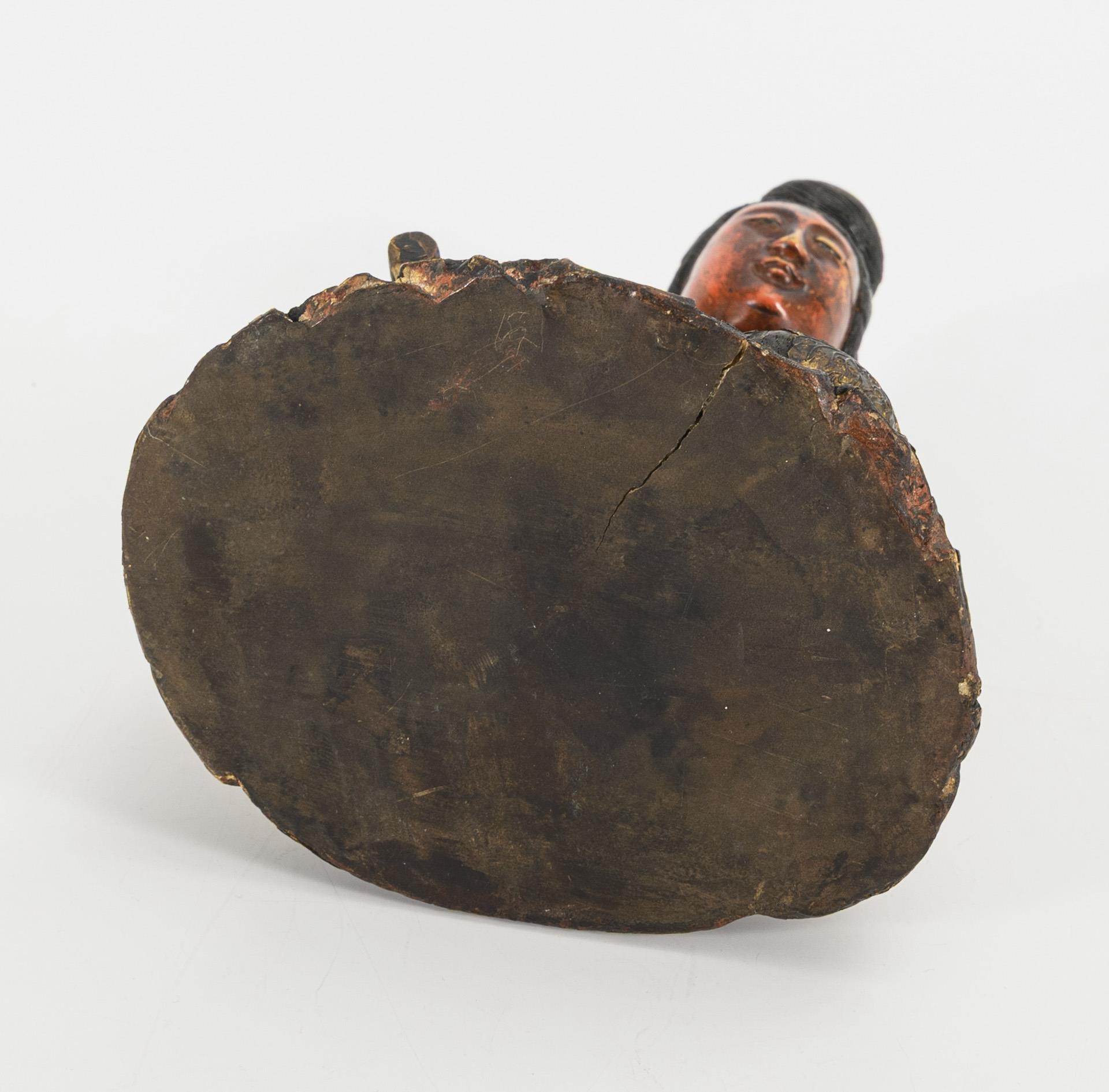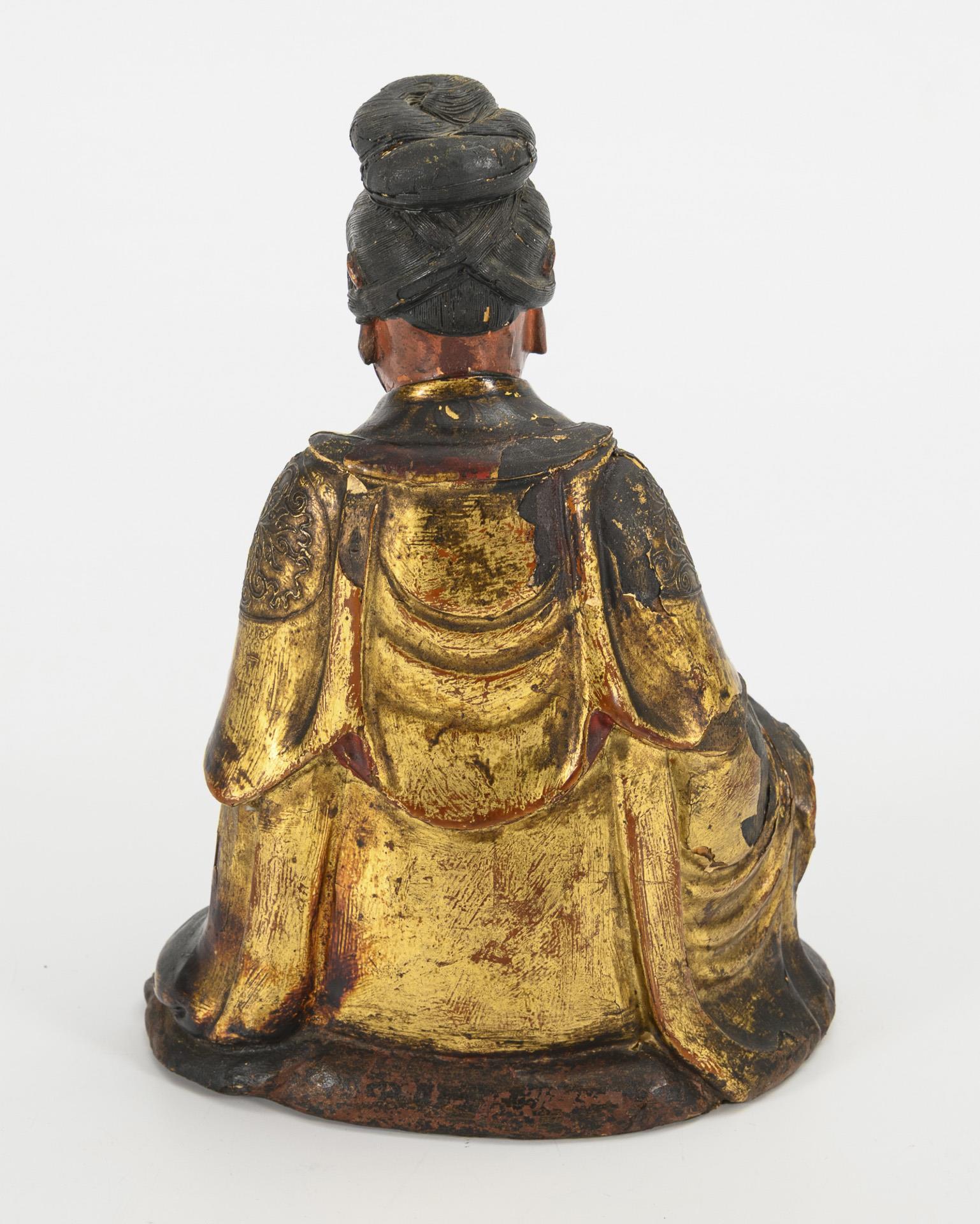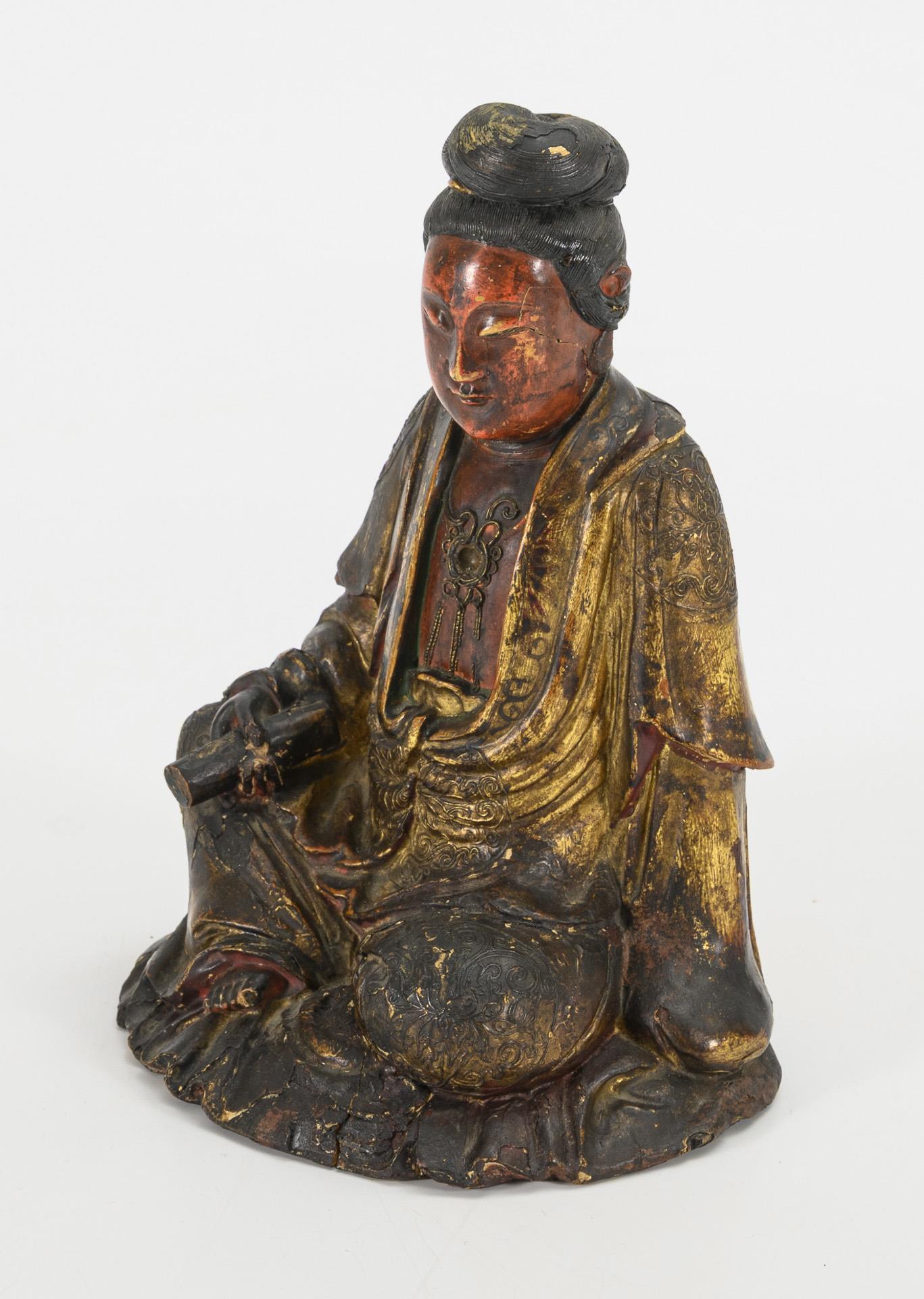 Fein geschnitzte Holzfigur mit beriebener Farbfassung. Sitzende Figur in kostbarer Kleidung, mit Schriftrolle in der Hand. Die langen Haare zu einem Dutt aufgetürmt.