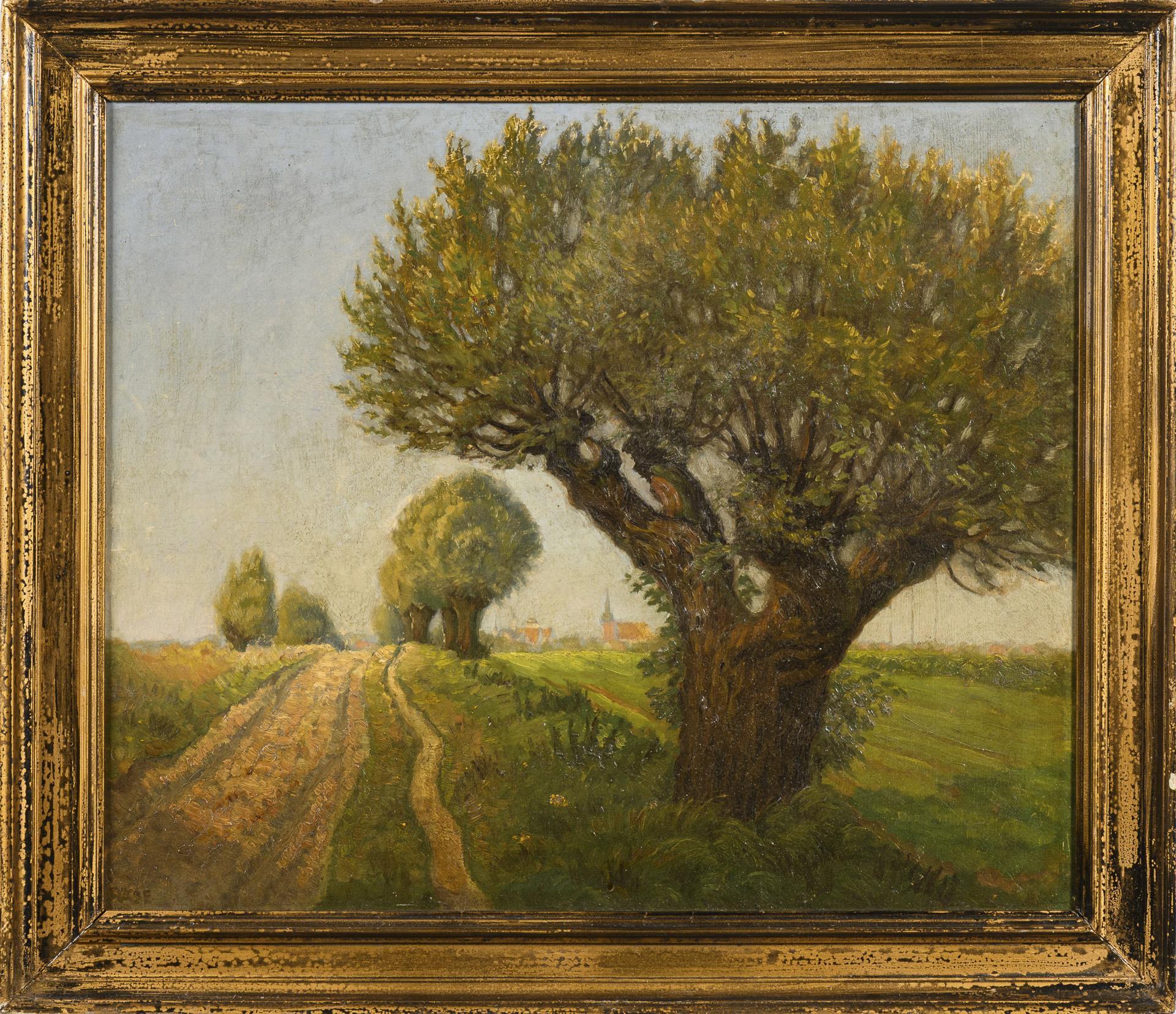 Die Bäume am Straßenrand unweit des Dorfes an einem sonnigen Tag.