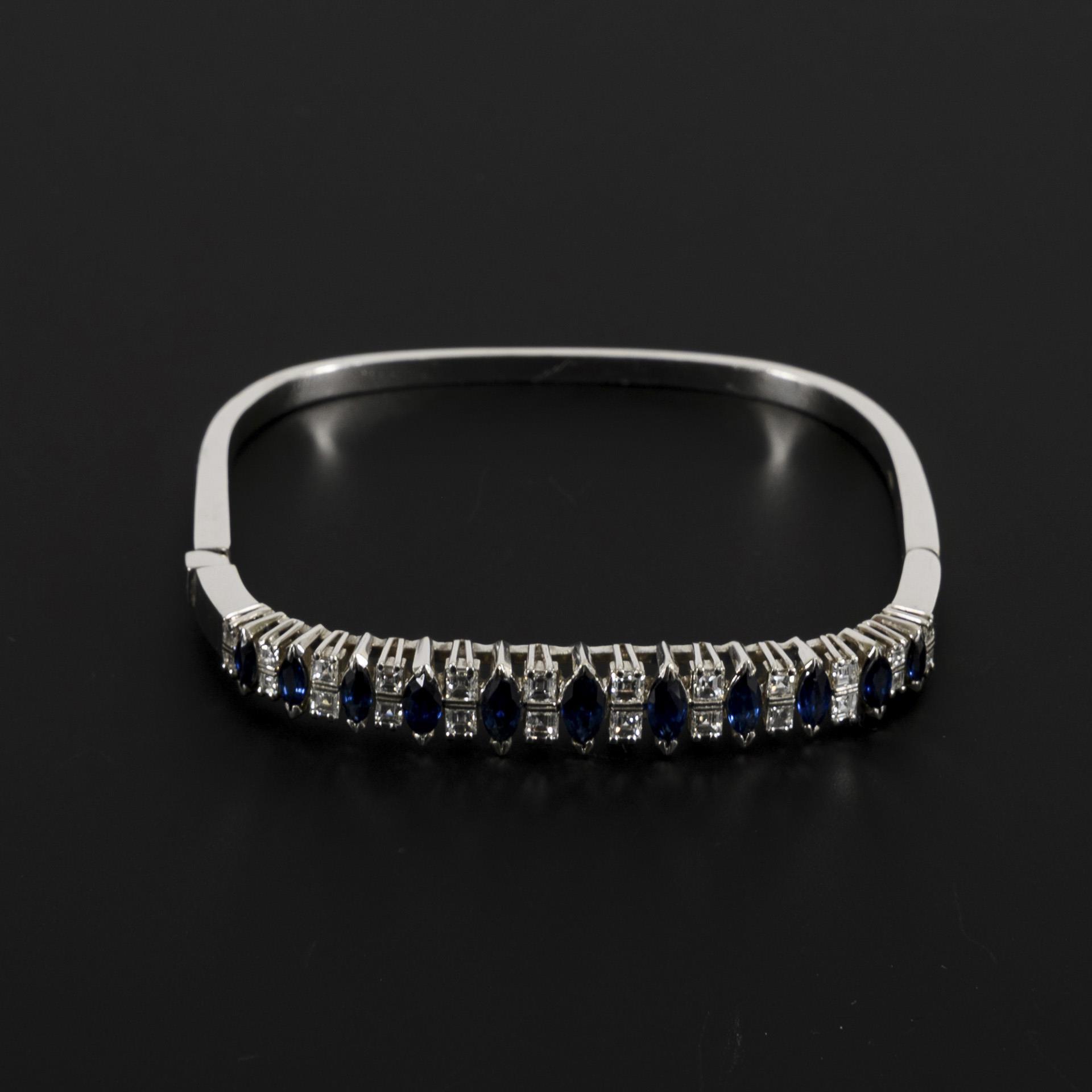 Armreif mit einem schauseitig im Verlauf gestalteten Besatz aus Saphiren und alternierend je 2 Diamant-Carrés. Mit seitlichem Kastenschloss-Mechanismus, der Armreif nicht rund, sondern rechteckig anmutend ausgeformt. Leichte Tragespuren, eine kleine, tiefere Delle.