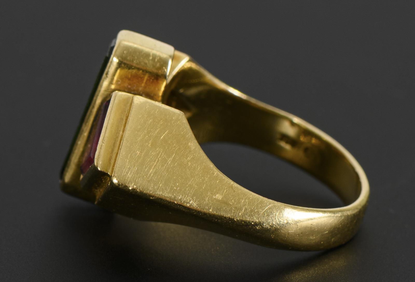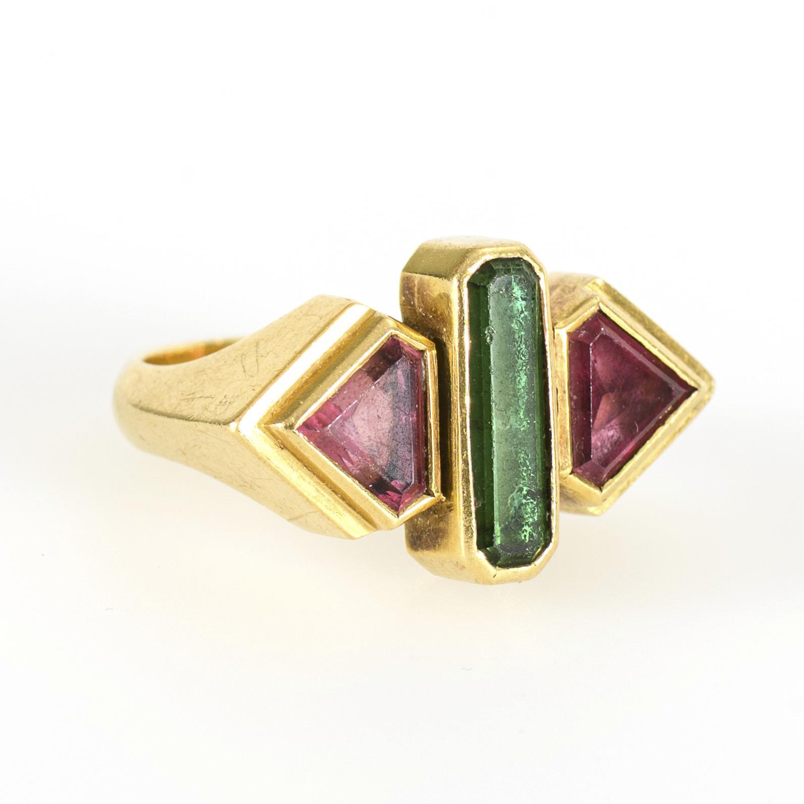 Schwerer Ring in grafischer Formgestaltung mit zwei rosafarbenen sowie einem grünen Turmalin. Leichte Tragspuren, Turmaline mit kleinen Chips.