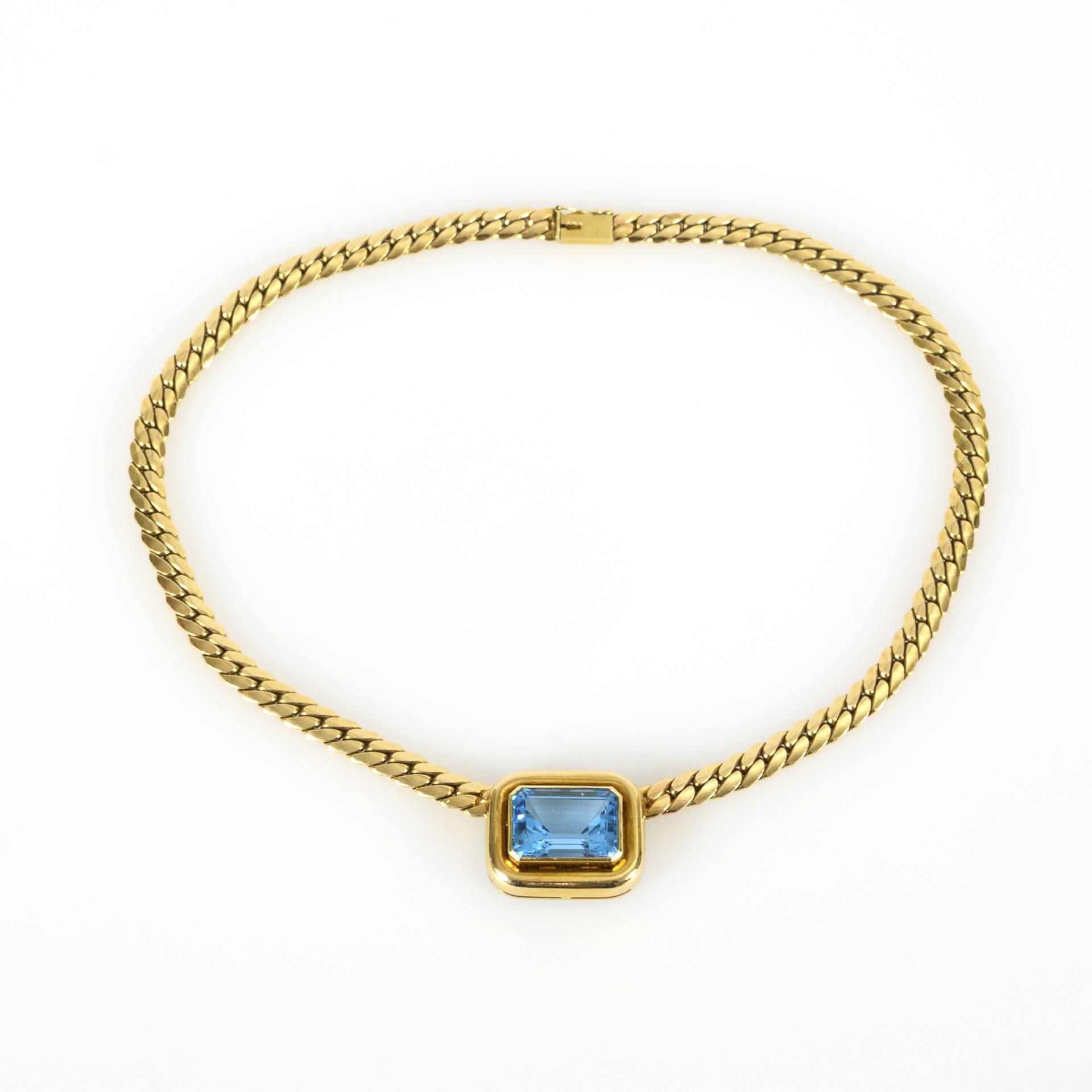Gelbgold 585 gestempelt. Kettenlänge 42,5 cm, der Topas (in der Fassung gemessen) ca. 13,00 x 18,50 mm. 73,78 g.