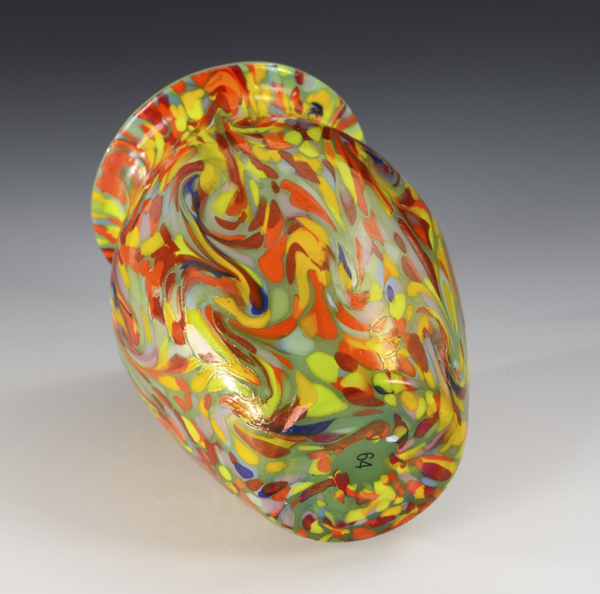 Jadegrünes Glas mit vielfarbigen Kröselaufschmelzungen. H 14,5 cm.