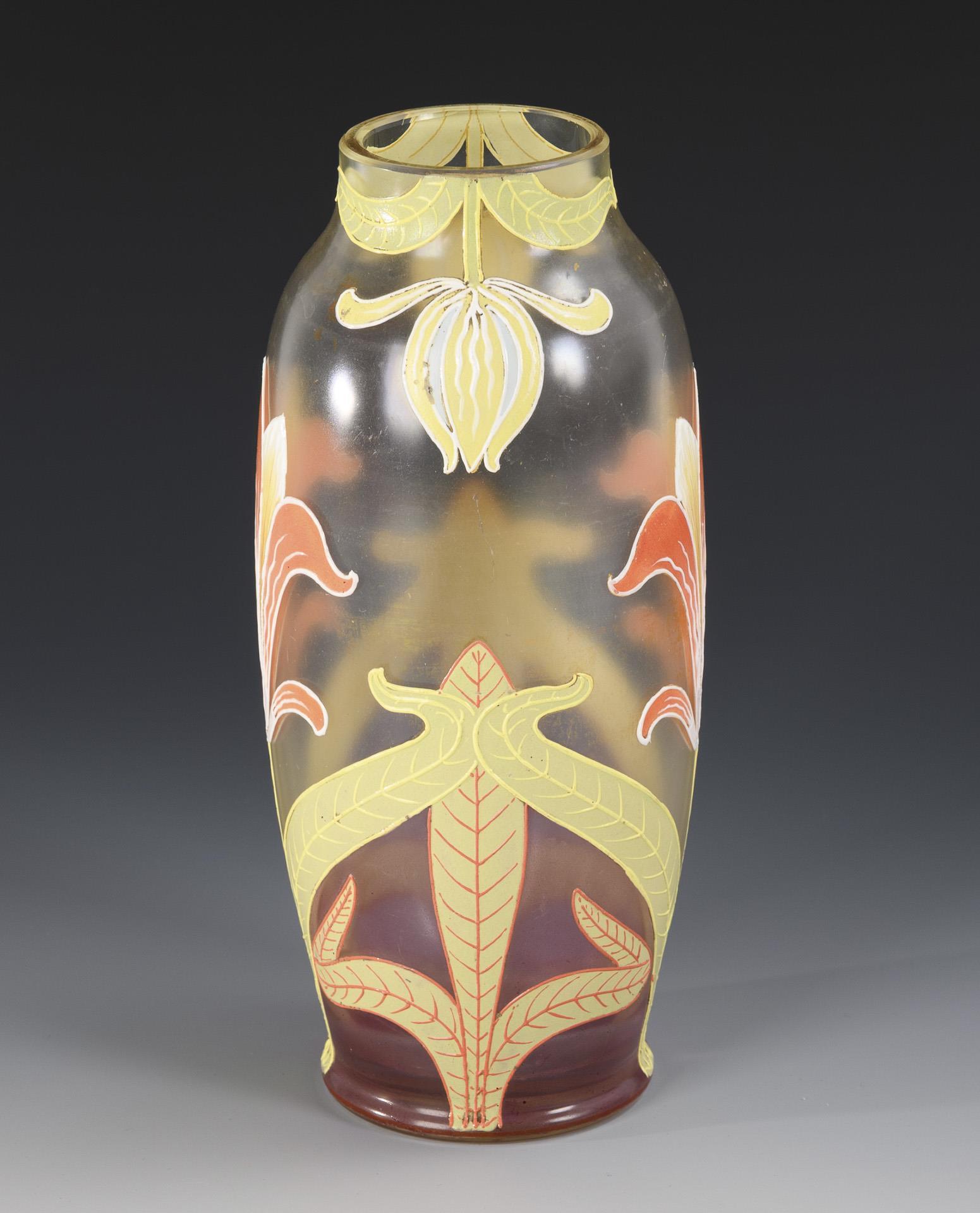 Balustervase aus farblosem, satiniertem Glas mit polychrom emailgemaltem Floraldekor.
