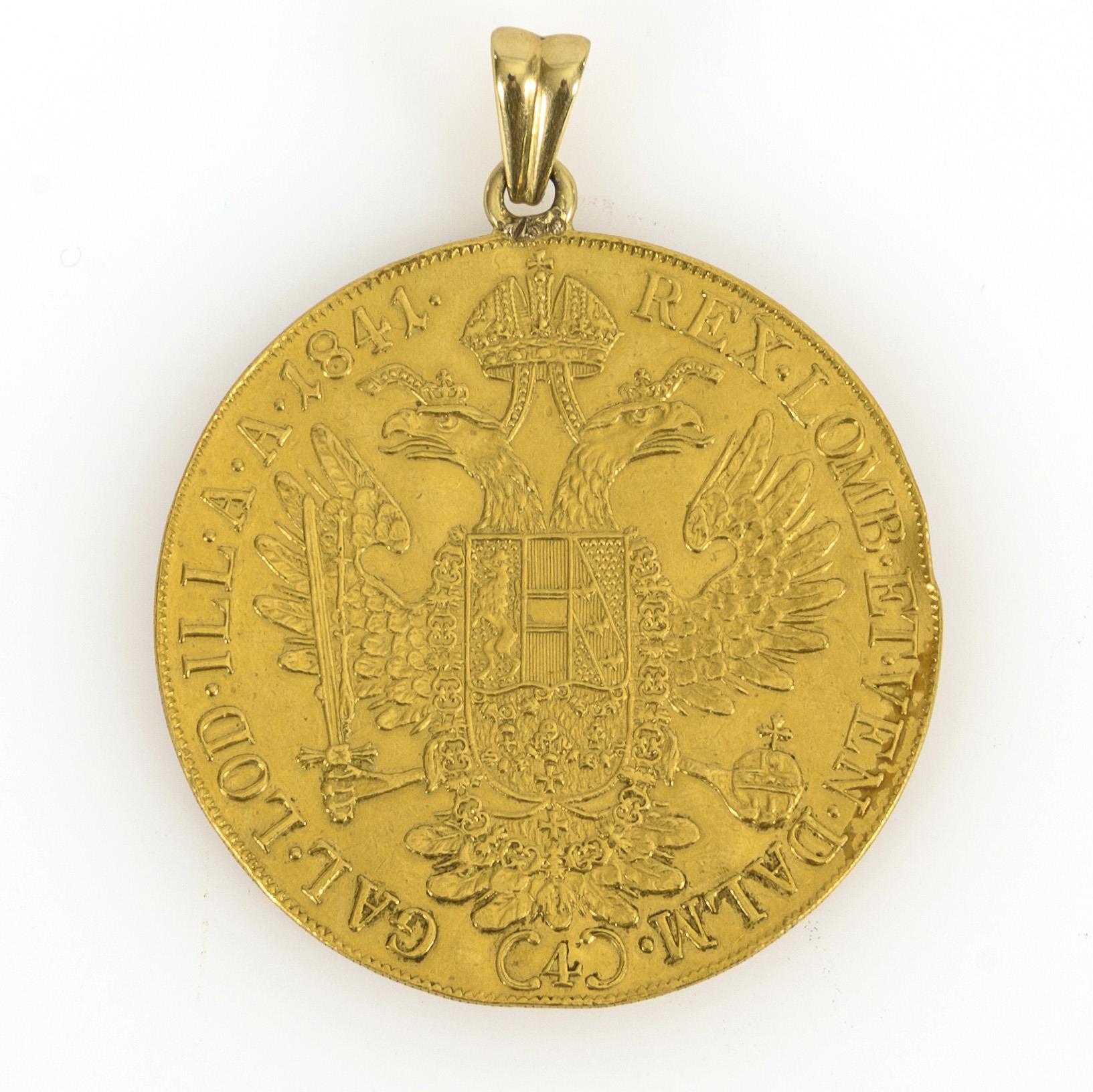 4 Ducaten, Österreich-Ungarn, Ferdinand I.. "Ferd I D G Austr Imp Hung Boh R H N V", "Rex Lomb Et Ven Dalm (4) Gal Lod Ill A A 1841". Öse und Schlaufe, Gold geprüft.