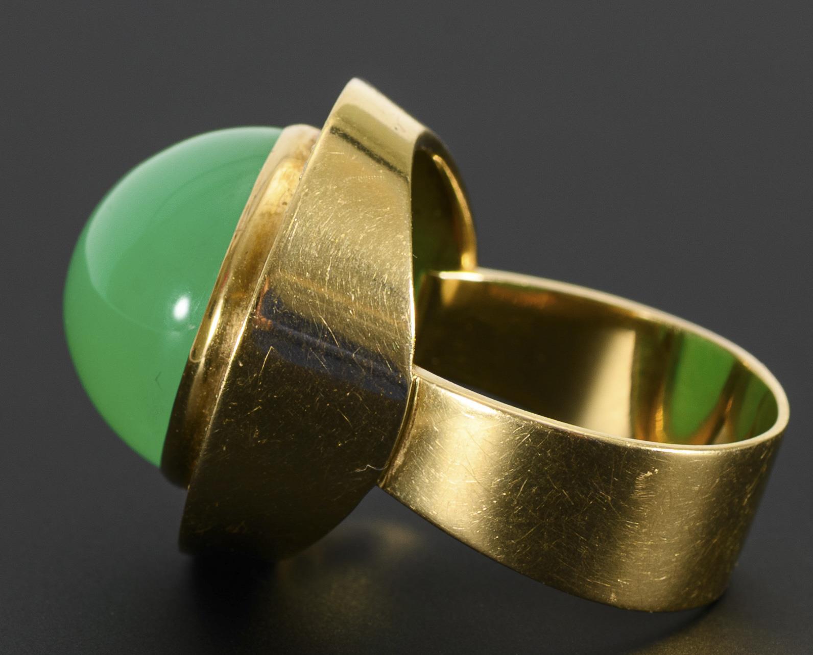 Gelbgold 750 gestempelt. Ringgröße 57, der Ringkopf im Durchmesser 21,93 mm, Höhe ca. 14,15 mm, Durchmesser des Chrysopras-Cabochons (in der Fassung gemessen) ca. 16,80 mm. 16,03 g.