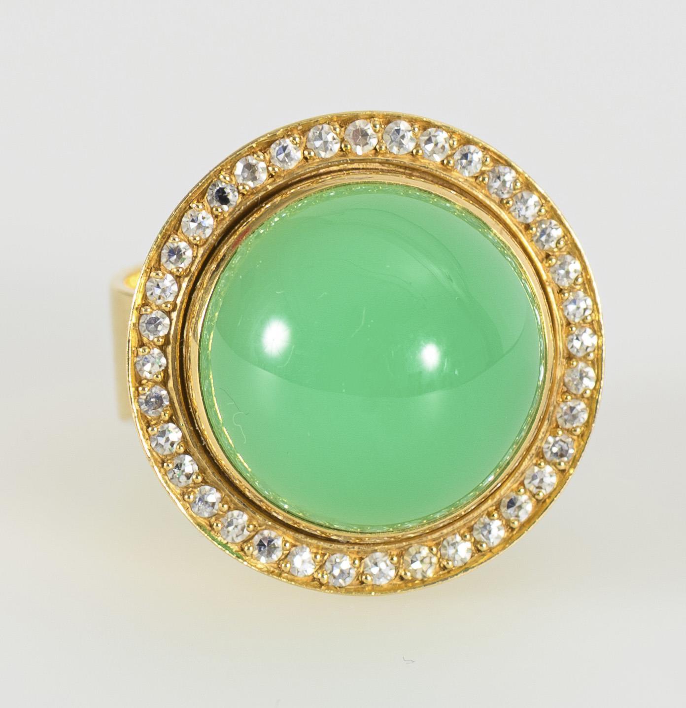 Ring mit großem, erhabenem Ringkopf mit Chrysopras-Cabochon, dieser umgeben von 36 kleinen Brillanten. Passend zu Anhänger an Kette Kat.-Nr. 179. Ringschiene und Aufbau des Ringkopfes mit leichten Tragespuren.