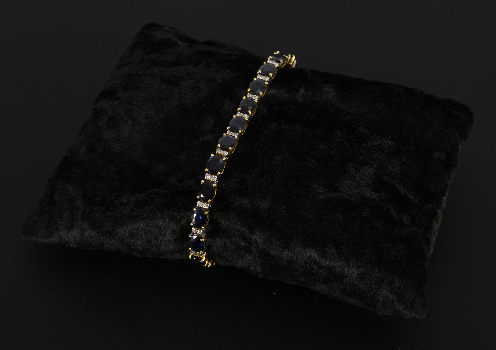 Zweifarbiges Armband mit 23 in Gelbgold krappengefassten Saphiren im Ovalschliff und alternierend dazu kleineren Gliedern mit einem Besatz aus 46, davon je paarweise in Weißgold gefassten kleinen Brillanten. Das Kastenschloss mit doppelter Achtersicherung.