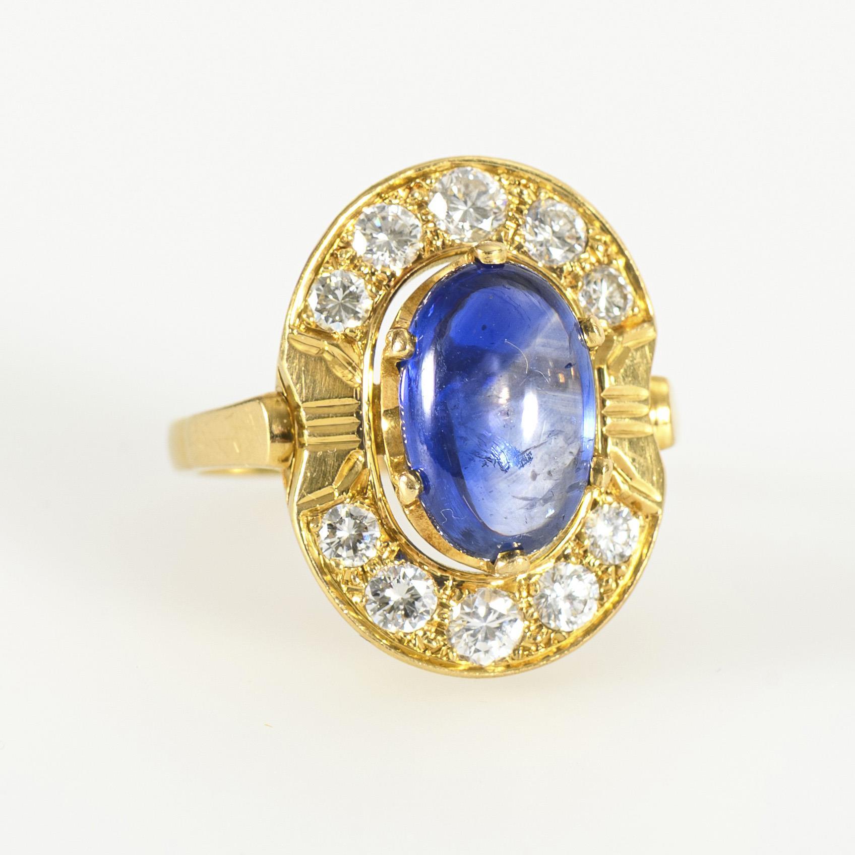 Ring mit großem, ovalem Ringkopf, dieser besetzt mit einem krappengefassten, ovalen Saphir-Cabochon, umgeben von 10 eingelassenen Brillanten.
